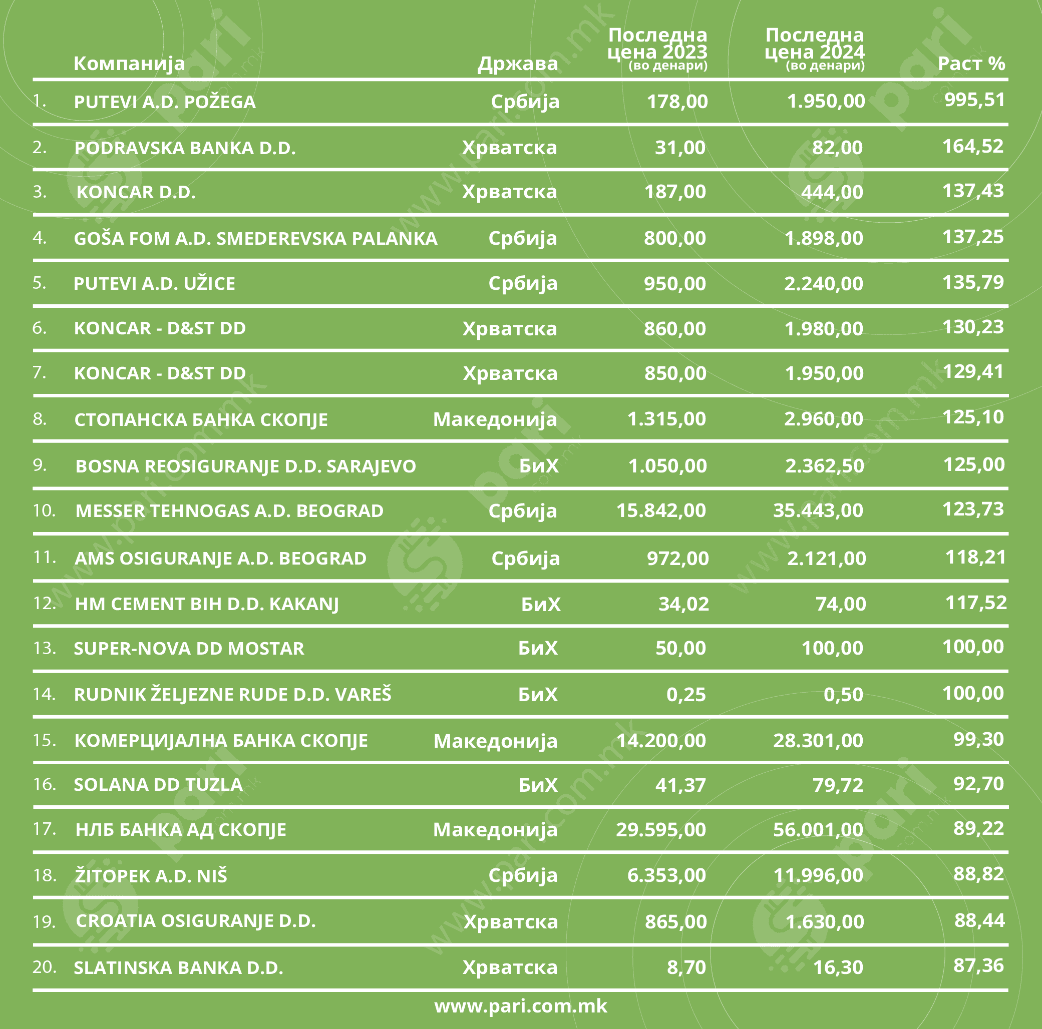Овие дваесет компании бележат огромен раст на цената на нивната акција во услови кога берзите на кои котираат, со исклучок на Македонската берза, имаат поскромни резултати. Македонскиот берзански индекс предводи во регионот со годишен раст од 65,99 насто. Главниот индекс на Љубљанската берза порасна за 34,23 насто, а на Белградската берза за 30,6 насто. Crobex-индексот на Хрватска берза бележи раст од 25,9 насто, а главниот индекс на Сараевската берза од 17,36 насто. Берзата во Подгорица во 2024 година забележа раст на вредноста на главниот берзански индекс од скромни 2,1 насто.