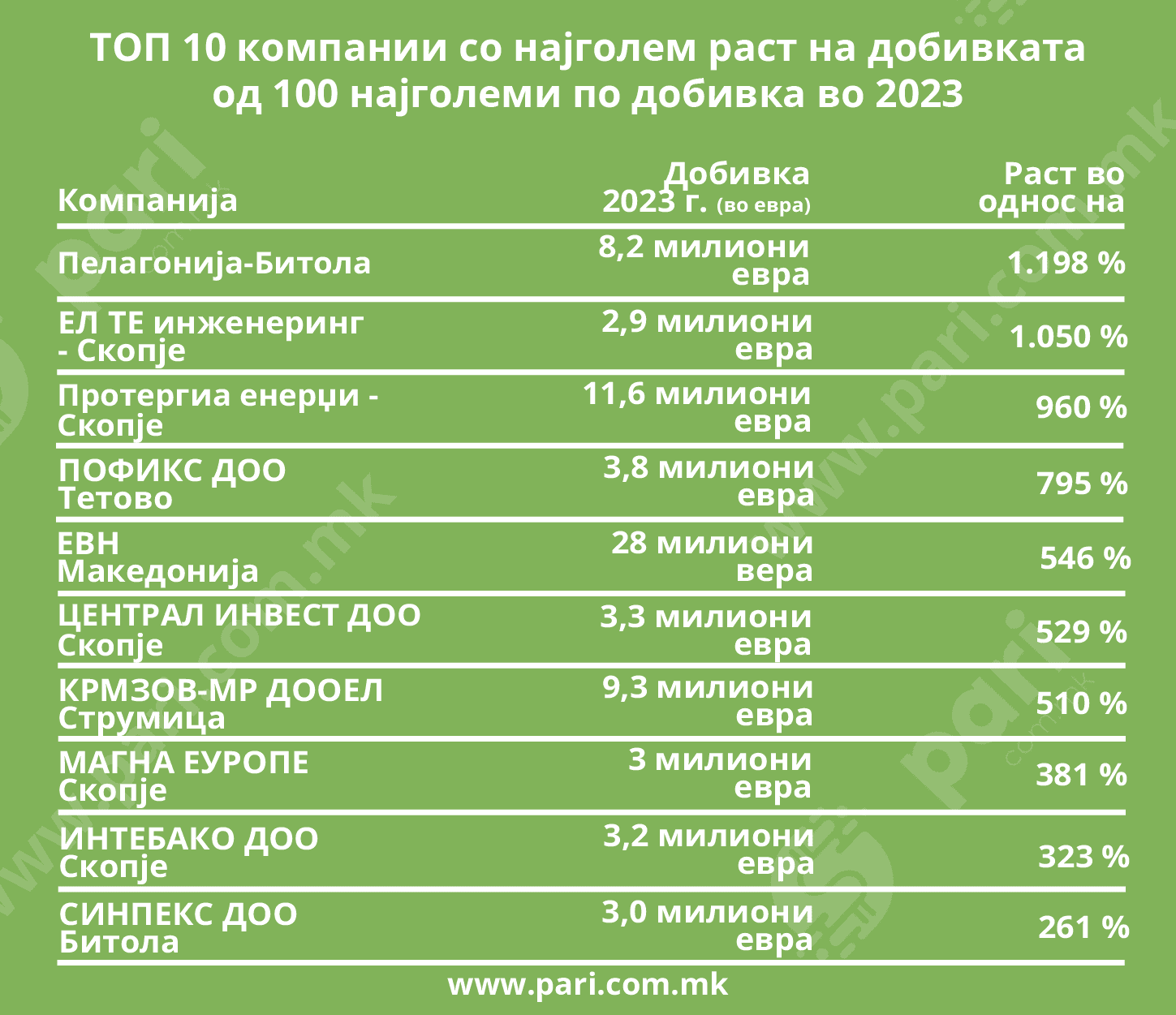 Податоците покажуваат дека сите овие компании, освен ЕВН Македонија, во 2022 не биле во рангираните 100 најголеми по добивка, но во 2023 година се дел од таа листа.