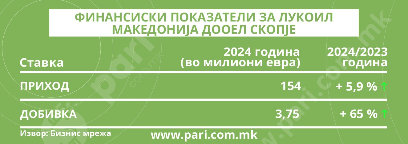 Минатата година во пумпните станици на Лукоил низ Македонија се наточени нафтени деривати во вкупна вредност од 154 милиони евра, со што реализирал приход поголем за 5,9 насто во однос на 2023 година. Тоа на компанијата ѝ донело добивка од 3,75 милиони евра, што е за 65 насто повеќе отколку во 2023 година!