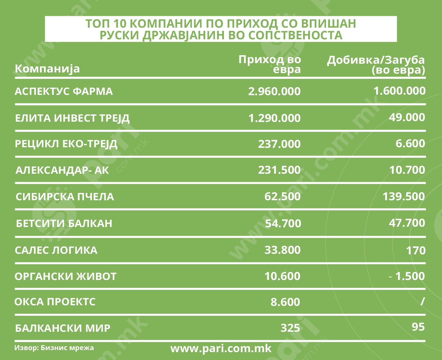Со овие две компании завршува листата на фирми милионери по приход кои официјално во сопствеништвото запишале руски државјанин.