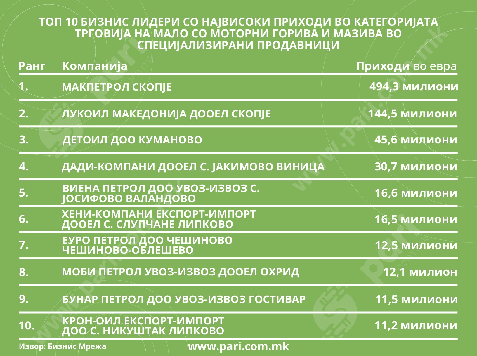 Податоците покажуваат дека 10 бизнис-лидери со највисоки приходи, кои продавале нафтени деривати на мало, во 2023 година направиле заеднички приход од околу 796 милиони евра, 10 бизнис-лидери по добивка направиле заедничка добивка од околу 19 милиони евра, а 10 бизнис-лидери во оваа дејност што се истакнале како најголеми работодавачи заедно вработуваат 2.927 рабoтници.