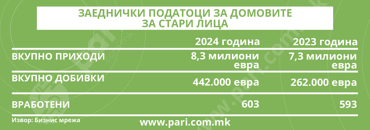 Порталот Пари, во соработка со Бизнис мрежа, ги стави под лупа домовите за стари лица. Анализиравме колку приходи наплатиле, колку им се добивките, колку луѓе вработуваат. Во анализата се опфатени 40 установи, но за дел од нив нема податок затоа што или не се трговски друштва, или немаат доставено финансиски податоци. Затоа, ова е ориентациона анализа. Податоците покажуваат вкупен приход на домовите од 8,3 милиони евра, што е повеќе отколку во 2023 година, кога наплатиле речиси 7,3 милиони евра. Добивката на домовите за стари лица (и за оние на коишто им треба постојано сместување и нега од здравствени причини) во 2024 година изнесувала 442.000 евра, додека во 2023 година била 262.000 евра (заокружени бројки). Во домовите за стари лица лани имало вкупно 603 вработени, а претходната година 593.