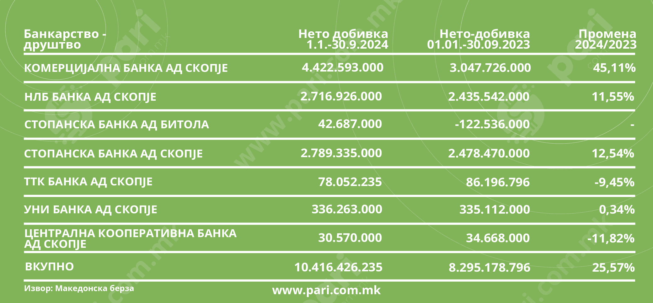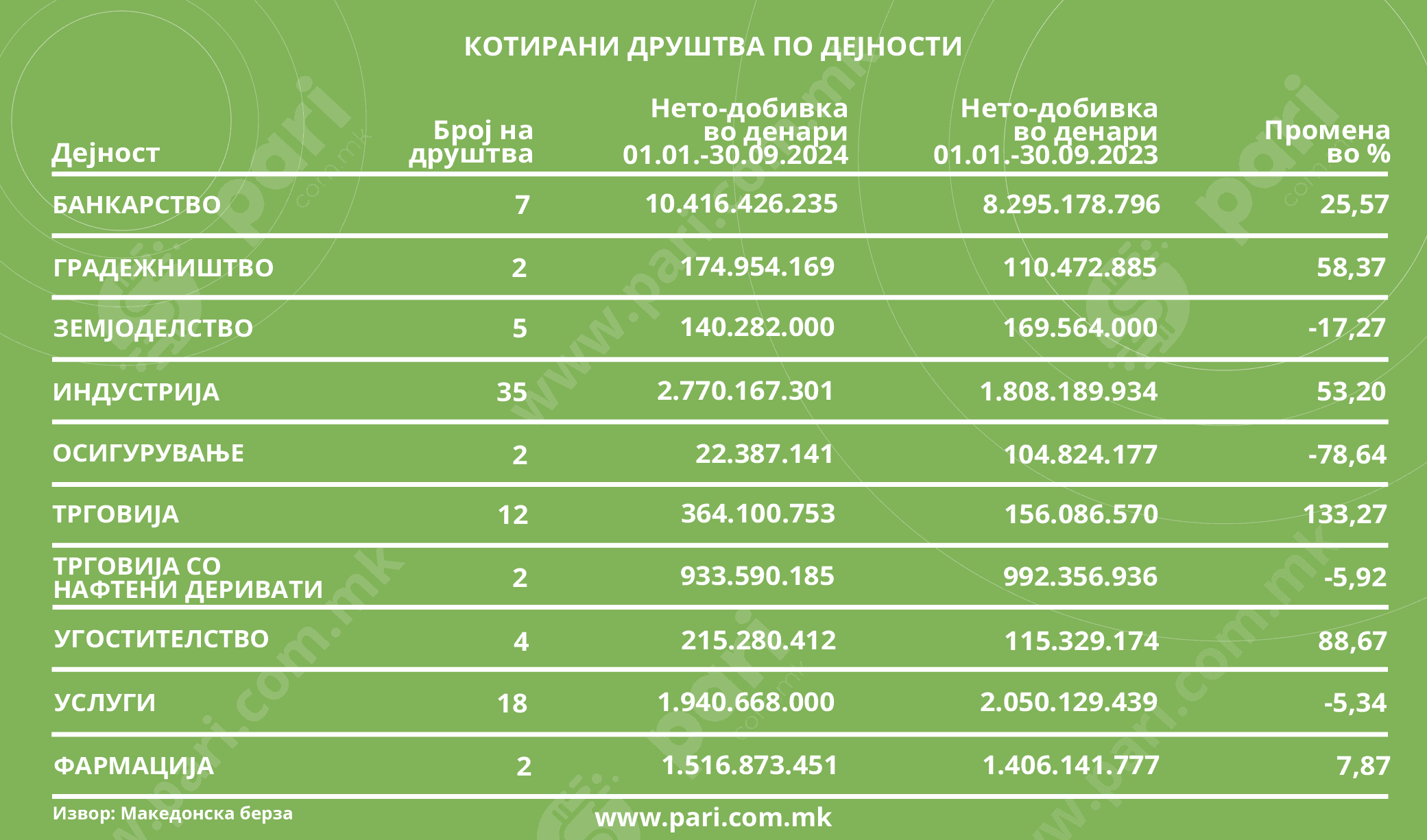Банки – На берзата се тргува со акциите на седум банки. За девет месеци креирале профит од 10.416.426.235 денари или 169,37 милиони евра (лани во тој период 8.295.178.796 денари/134,8 милиони евра). И има разлика од 25,57 проценти. Најголемиот исчекор кај добивката го направила Комерцијална банка (45,11%), која убедливо предничи со износот од 72 милиони евра. Скопската Стопанска банка има зголемување од 12,54%, а НЛБ банка 11,55%. Повисока добивка има и УНИ банка, за 0,34%. Пад кај профитот бележат две банки: ТТК (-9,45%) и Централна кооперативна банка (-11,82%). Стопанска банка Битола, пак, со остварената добивка се извлече од претходниот негативен финансиски резултат.