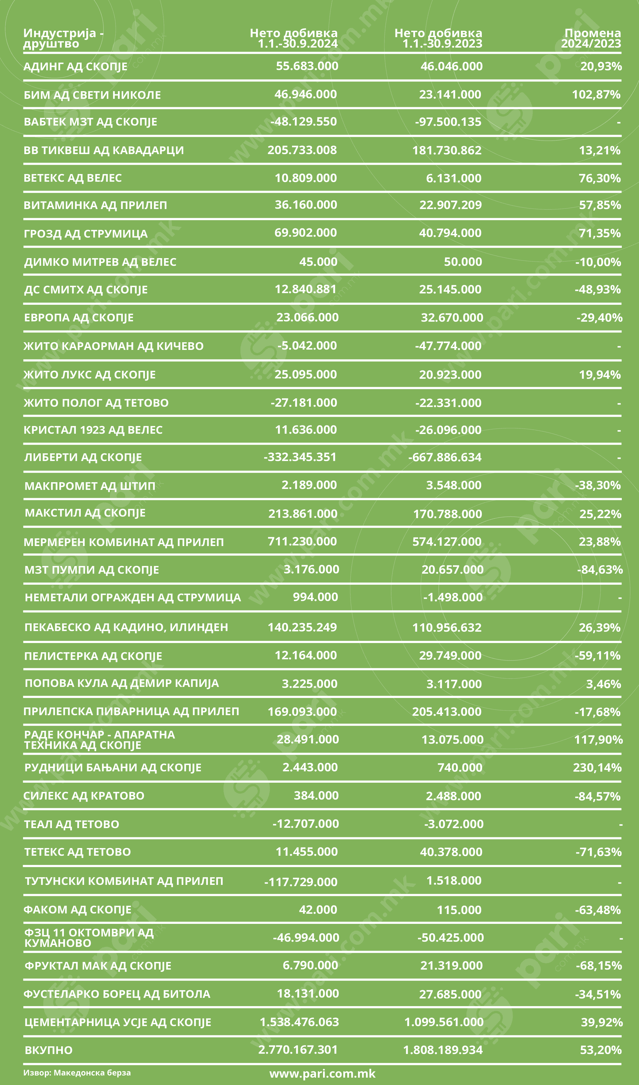Индустрија – Заедничкиот нето-профит изнесува 2.770.167.301 денар (над 45 милиони евра). Надминат е за 53,2 насто во споредба со ланскиот деветмесечен резултат (1.808.189.934 денари/29,4 милиони евра). Инаку, од 35-те друштва од дејноста индустрија, седум работеле со загуба.