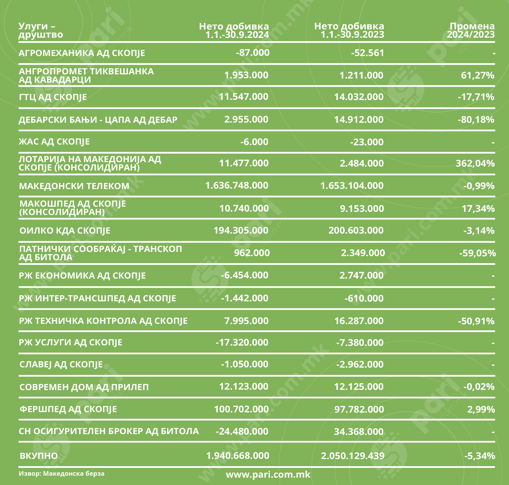 Услуги – Од оваа дејност на берзата се 18 друштва. Од јануари до септември нивната заедничка добивка е во износ од 1.940.668.000 денари (31,5 милиони евра). И, е за 5,34% помала од минатогодишните 2.050.129.439 денари (33,3 милиони евра). Ова, всушност, е одраз на состојбите во одделни компании – седум одработиле со загуба, а шест со пониска добивка во однос на споредбениот период.