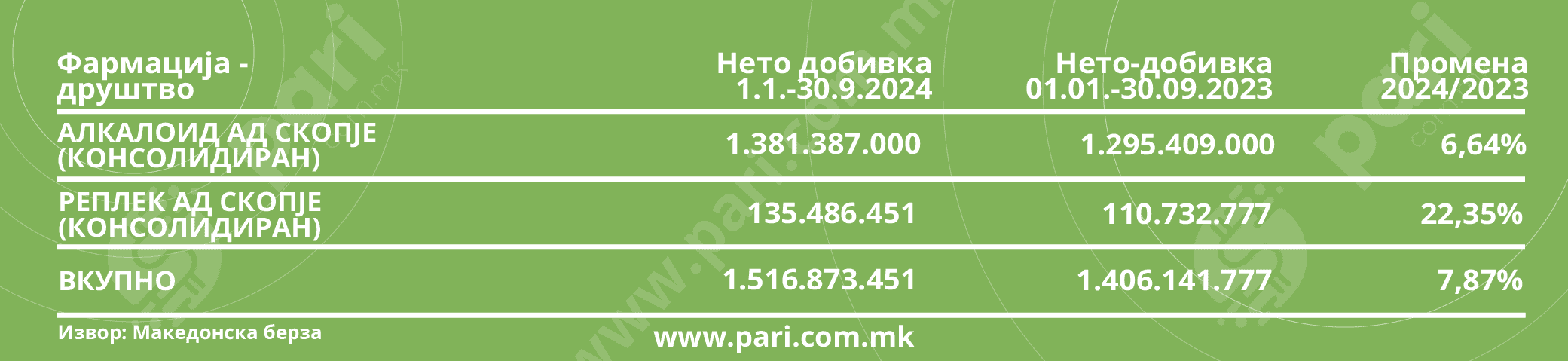 Фармација – Две скопски компании се на берзата од доменот на фармацијата, каде што нето-добивката е 1.516.873.451 денар или 24,6 милиони евра. Од аспект на ланските 1.406.141.777 денари (22,8 милиони евра), постигнато е зголемување од 7,87%. Во деветмесечниот период, поголем е растот на добивката на „Реплек“ – за 22,35%. Со оглед на тоа што „Алкалоид“ е најголемата и најуспешна фармацевтска куќа во Македонија, има значително повисок профит чиј износ е во милијарди денари.