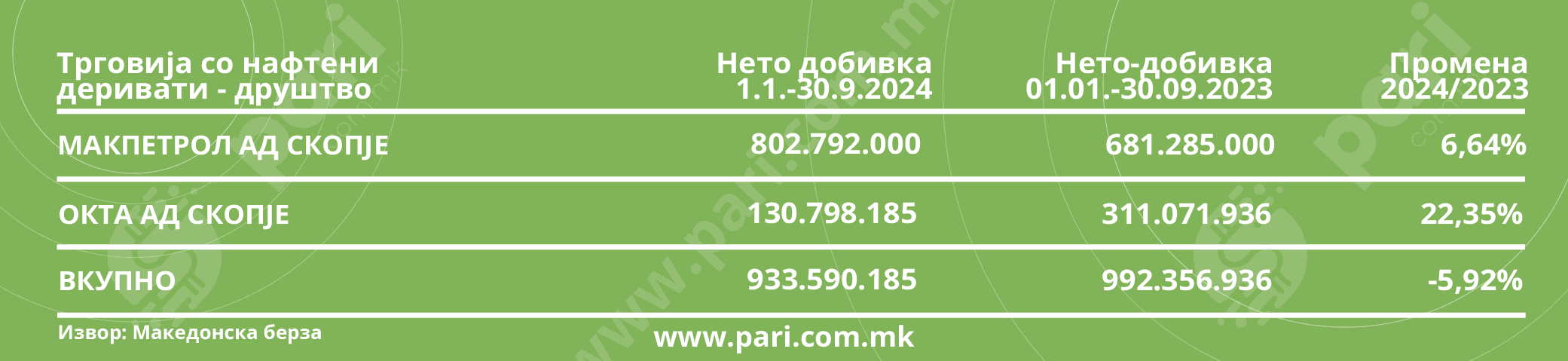 Трговија со нафтени деривати – Заедничкиот профит на двете друштва за една година опаднал за 5,92 отсто. Станува збор за износ, произлезен од деветмесечното работење, од 933.590.185 денари, односно 15,1 милион евра. Минатата година, пак, остварувањето било 992.356.936 денари (16,1 милион евра). Гледано засебно, добивката на „Макпетрол“ за една година се зголемила за 17,83%, а на „Окта“ се намалила за 57,95%.