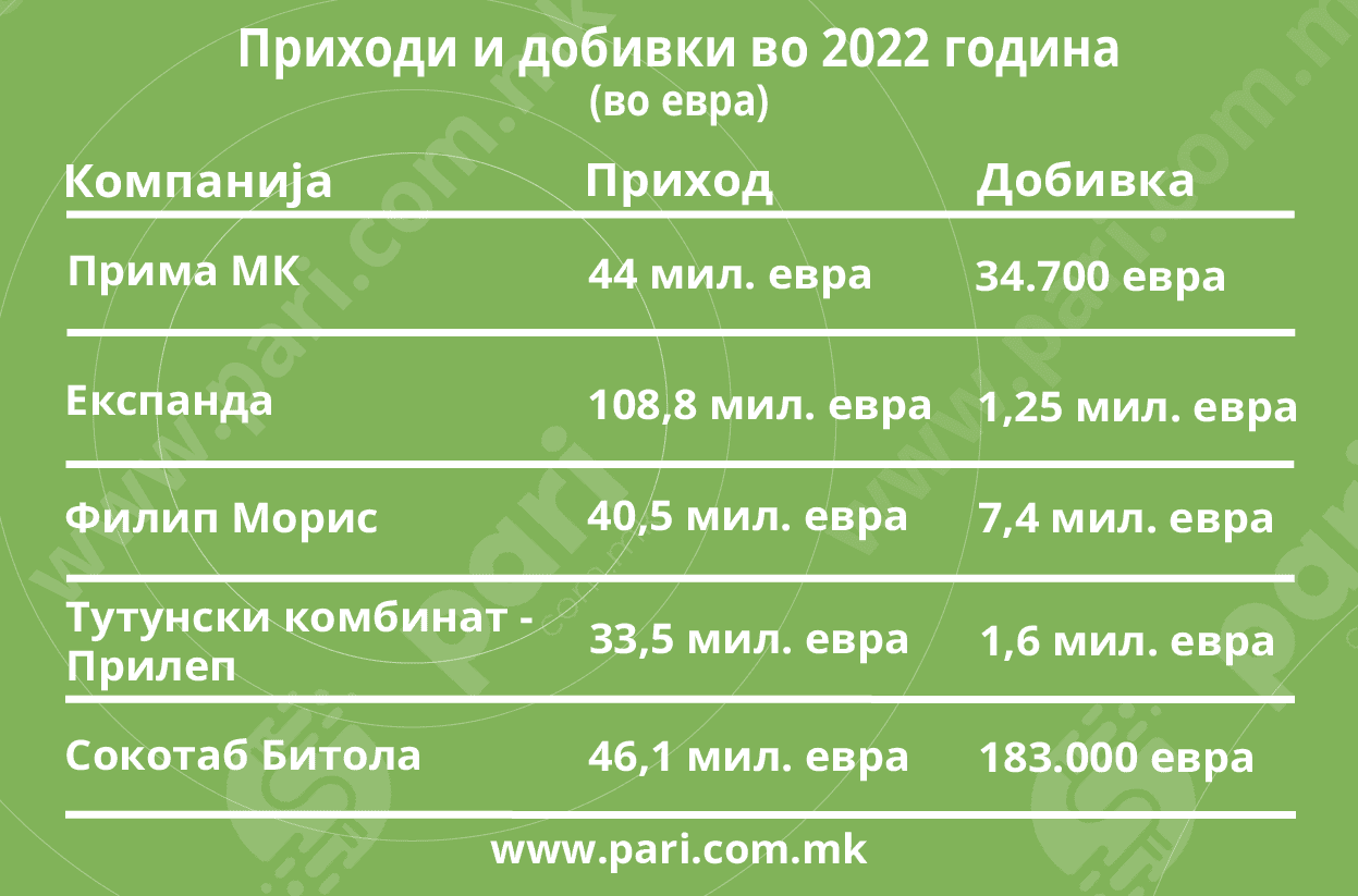 Она што особено паѓа в очи е малата добивка на „Прима мк“ во однос на реализираниот промет. Со промет од 44 милиони евра таму е релизирана добивка од нецели 35.000 евра. Со малку помал промет од 40,5 милиони евра, пак, „Филип Морис“ Тутунски комбинат – Прилеп направил добивка од 7,4 милиони евра. Тоа е најголемата добивка во друштвото на овие компании.