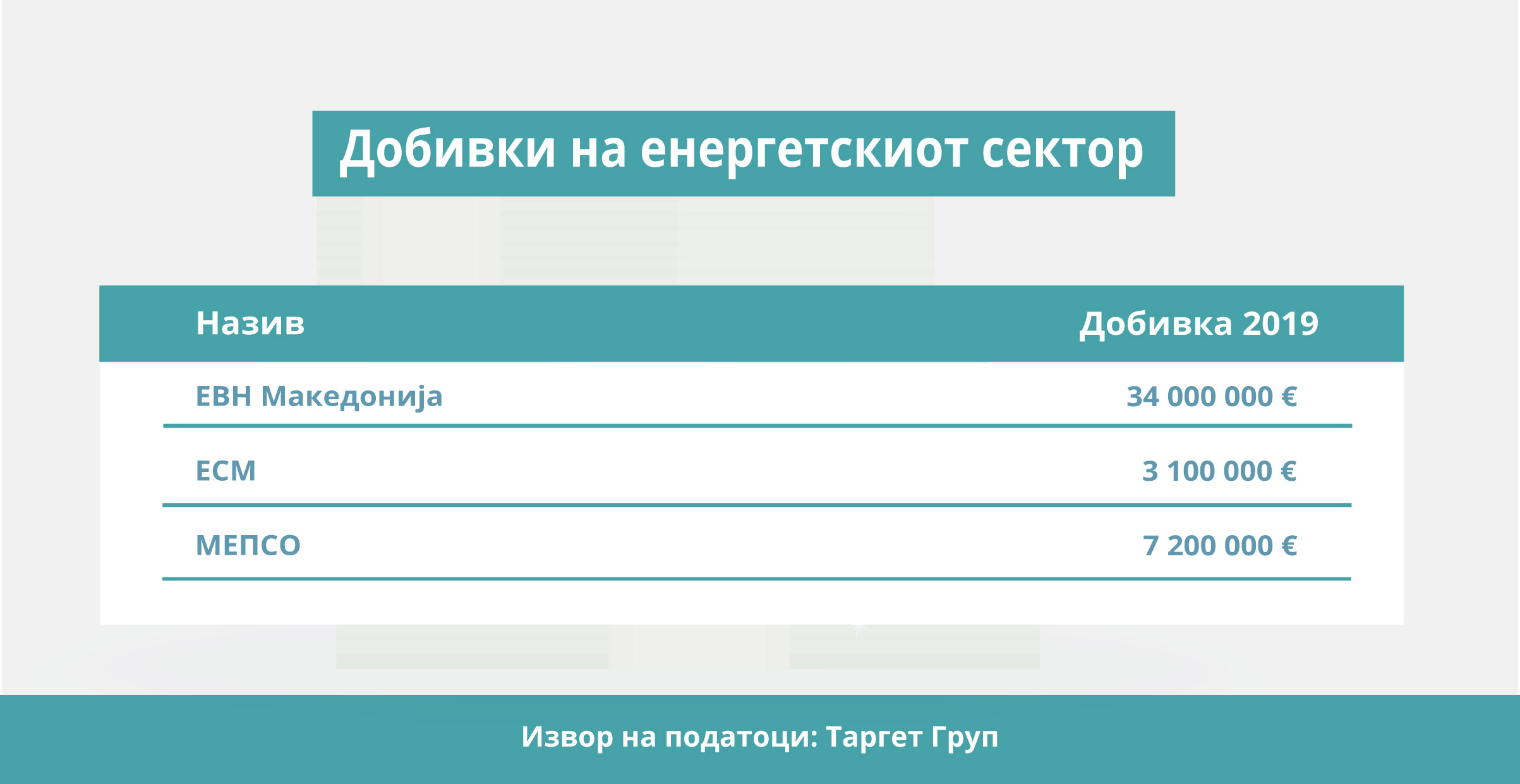 Еден од најпрофитабилните бизниси во земјава е енергетиката која генерира добивки што се бројат во десетици милиони евра. Па така, ЕВН Македонија – Акционерско друштво за услуги Скопје со добивка во износ од 34 040 000 евра е дури и меѓу првите пет најпрофитабилни компании. ЕВН лани успела да ја зголеми добивката во однос на 2018 година кога изнесувала 18 270 000 евра. Со тоа ЕВН од деветто место на листата на 100 најуспешни компании со вклучен државен сектор скока на петто место по остварена добивка.