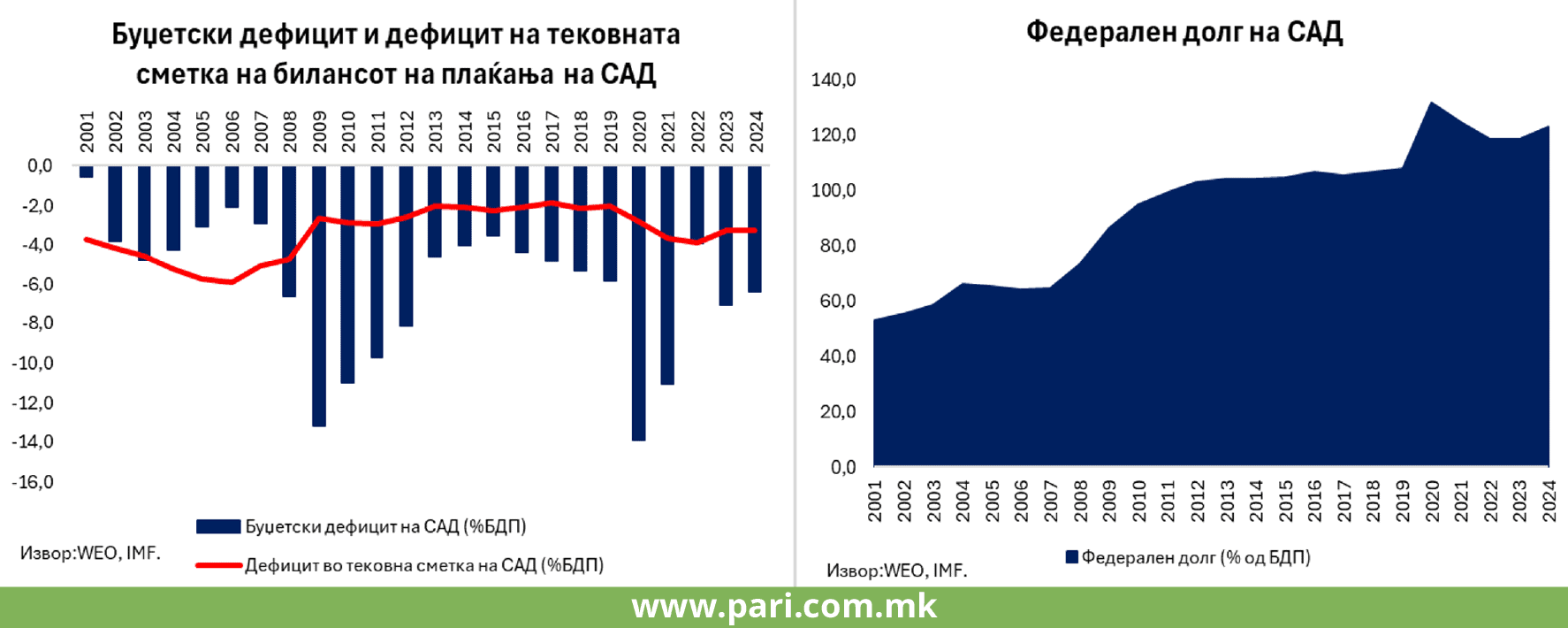 Но, Трамп е еднинствениот американски претседател кој отворено кажува дека одржливоста на економијата во САД веќе подолг временски период е доведена во прашање, односно дека ја губат доминацијата како светска економска сила. Федералниот долг на САД достигна 36 трилиони долари или 124% од БДП во 2024 година, а лимитот на задолжување беше подигнат неколку пати во последната деценија. САД во континуитет водат политика на високи буџетски дефицити, кои од 2001 година наваму (откако почна експанзијата на Кина) во просек, годишно изнесуваат 6% од БДП и имаат дефицит на тековната сметка на билансот на плаќањата, којшто во просек, годишно е околу 3,4% од БДП. Со тоа, САД веќе подолг временски период се соочуваат со twin deficits или дефицити – близнаци. За мали економии и за економии во развој ова е проблем, но за економијата во САД која ја има најмоќната валута на светот, ова не претставуваше проблем.