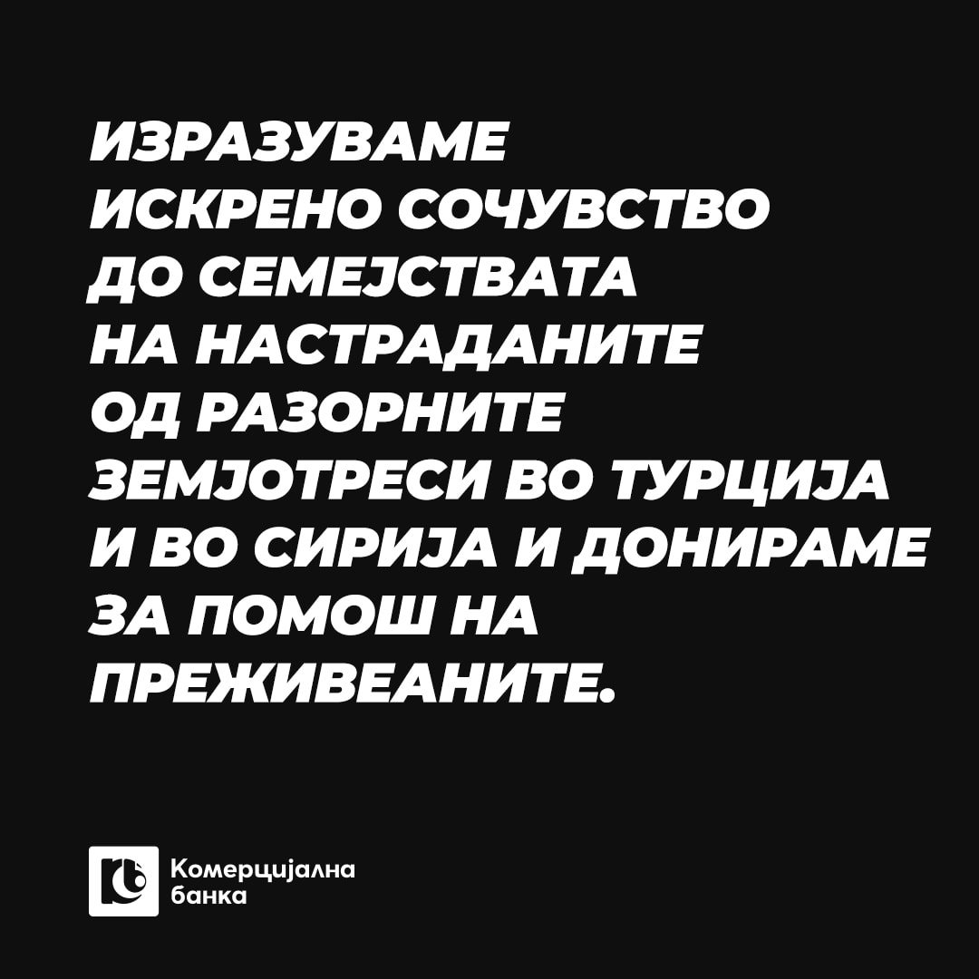 Нашите мисли се со семејствата на настраданите од разорните земјотреси во Турција и во Сирија, на кои им изразуваме длабоко сочувство и се молиме за спас на луѓето кои сѐ уште се под урнатините, ја информира јавноста Комерцијална банка.