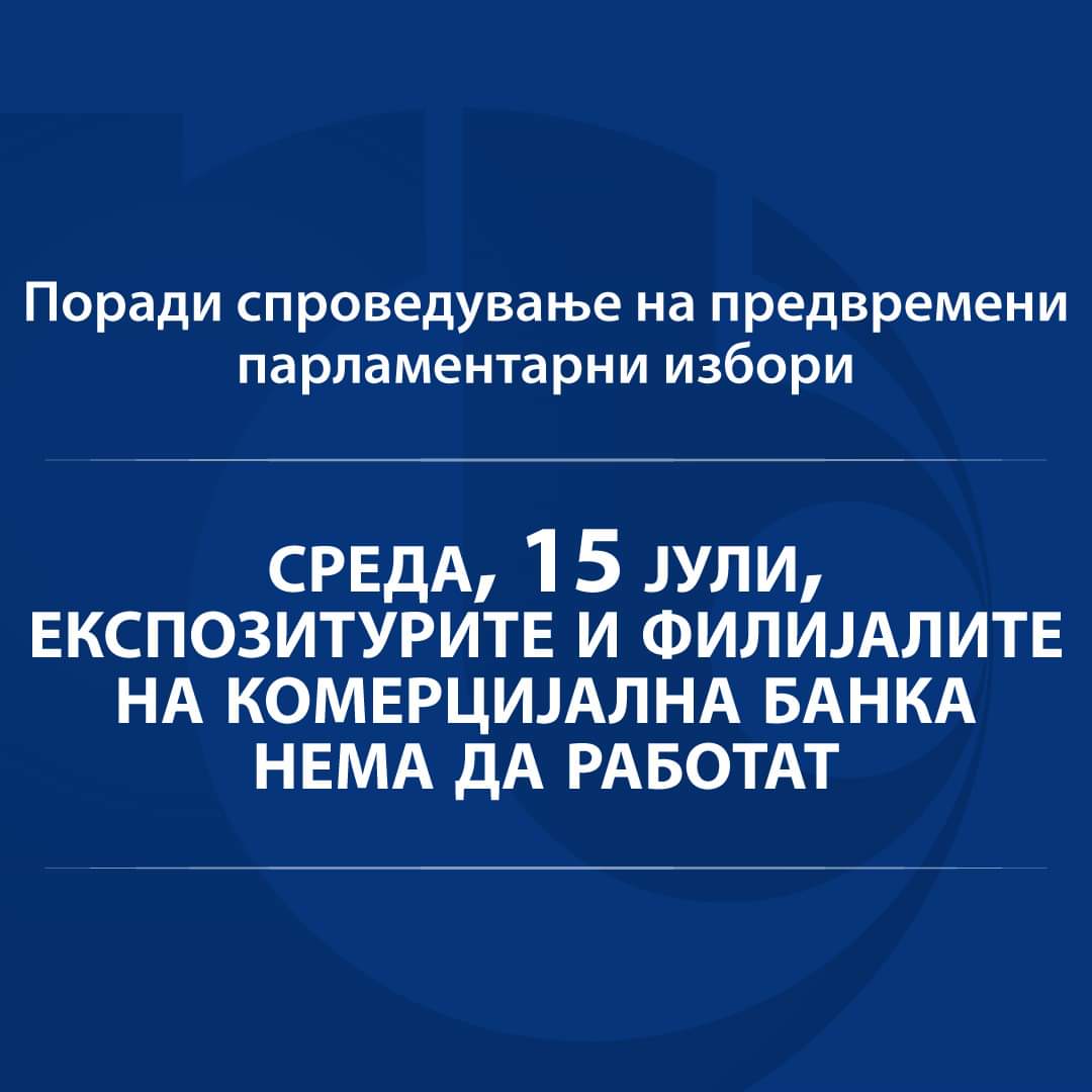 Филијалите и експозитурите на Комерцијална банка АД Скопје нема да работат на 15.07.2020 (среда) поради одржување на предвремените парламентарни избори.