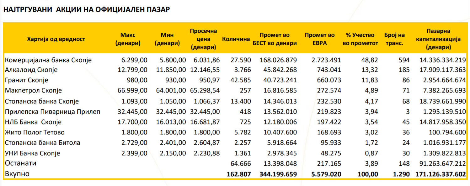 Вкупно биле извршени 1319 трансакции со вкупен промет од 382,668,819 денари.