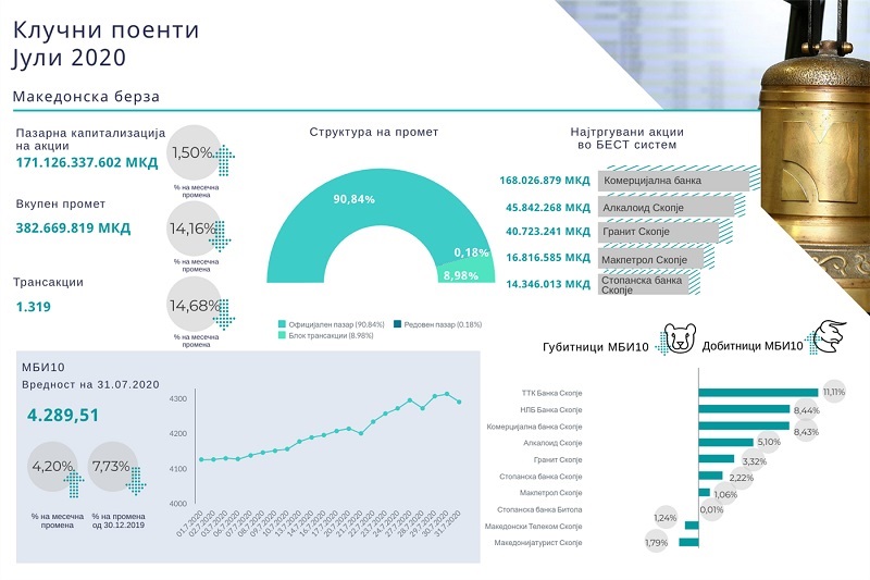 Македонската берза го објави билтенот за месец јули, каде е наведено дека Комерцијална Банка е на врвот на најтргуваните акции во Македонија. Останатите се: