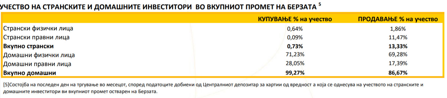 Еве како изгледаше учеството на странските и домашните инвеститори во вкупниот промет на берзата: