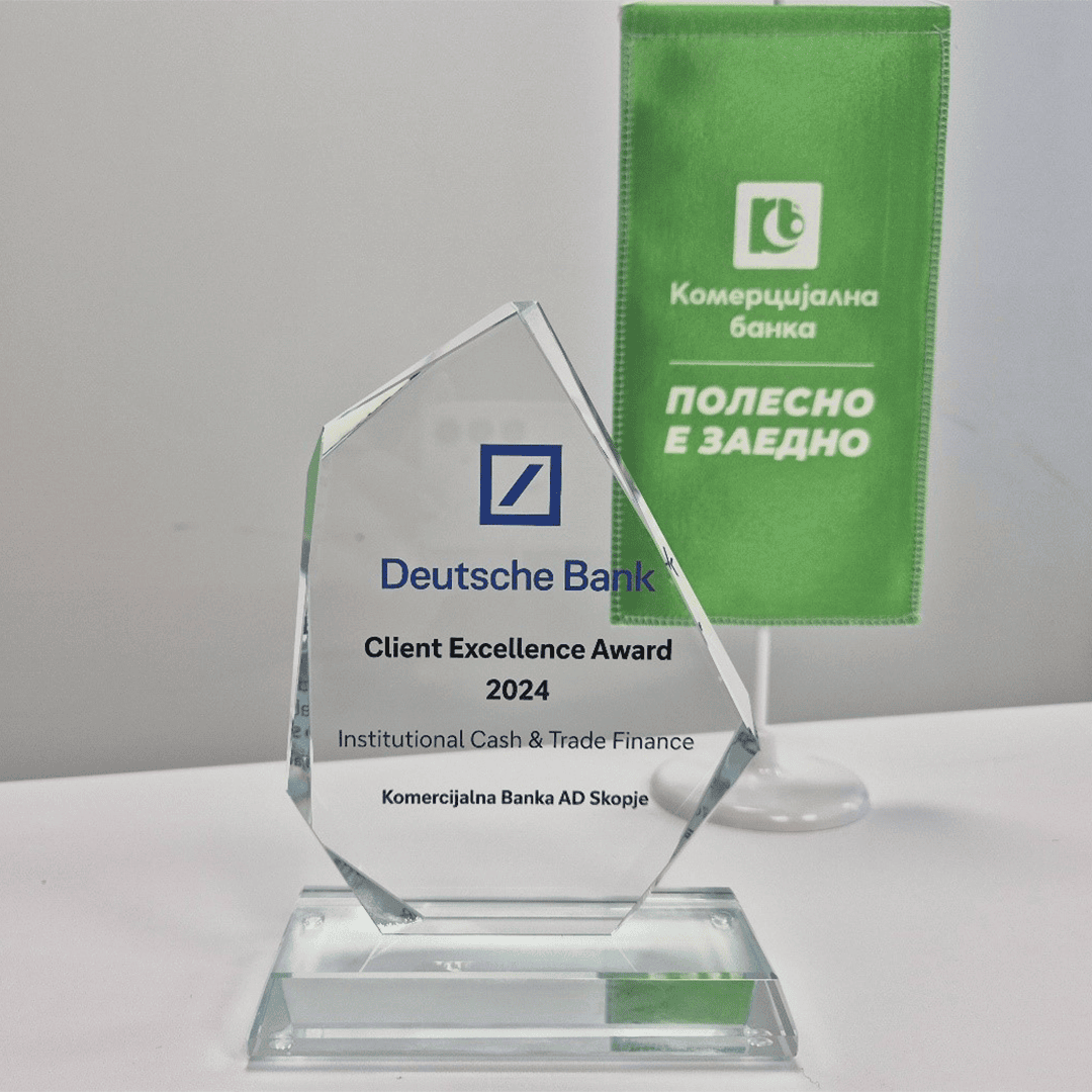 Deutsche Bank ѝ ја додели наградата „Client Excellence Award 2024 Institutional Cash Management and Trade Finance“ на Комерцијална банка како признание за беспрекорната директна обработка на меѓународните плаќања, соработката во доменот на надворешно трговските инструменти, како и сеопфатен квалитет на трансакциите од аспект на усогласеност со меѓународната регулатива и стандарди.