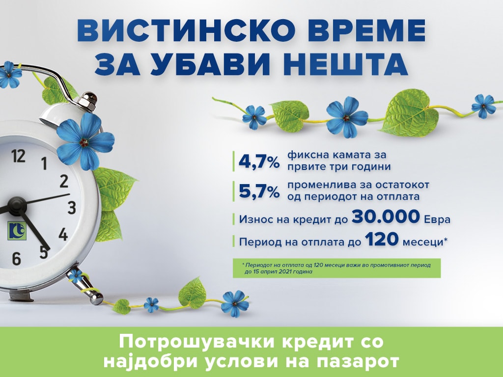 Ненаменскиот потрошувачки кредит овозможува шопинг уживање и помало месечно оптоварување на семејниот буџет. Со најновите услови, кредитот е со износ до 30.000 евра, со евро клаузула, а во промотивниот период од 01.03 до 15.04.2021 година може да се добие со рок на отплата до 120 месеци. И, уште поважно, има најниски каматни стапки на пазарот во моментот – 4,7% годишна, фиксна за првите 3 години, и 5,7% годишна, променлива за остатокот од периодот за отплата на кредитот. Овие каматни стапки се за клиенти кои примаат плата во Комерцијална банка. За лица кои примаат плата во други банки, каматните стапки изнесуваат 5,7% годишна, фиксна за првата година, и 6,7% годишна, променлива за остатокот од периодот за отплата на кредитот.