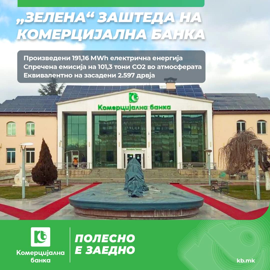 Нашиот придонес за поддршка на „зелената“ транзиција на општеството станува сѐ поголем. Комерцијална банка со сопствениот фотоволтаичен систем континуирано ги зголемува производството на електрична енергија и „зелената“ заштеда за заштита на животната средина, информираат од Комерцијална банка.Со инсталирани фотоволтаични системи на површина од 130 м2 на покривот на деловниот објект во центарот на Скопје и од 230 м2 во Филијалата во Прилеп, Комерцијална банка во 2022 година произведе 86,85 MWh електрична енергија и спречи емисија на 45,5 тони CO2 во атмосферата.