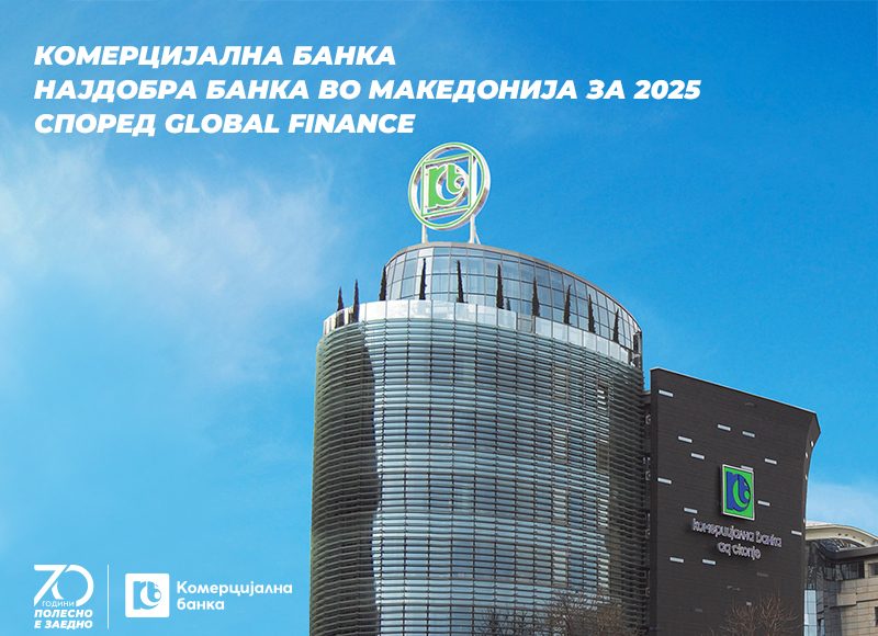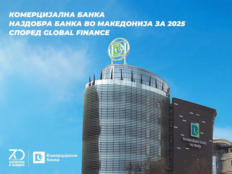Во годината кога одбележуваме значаен јубилеј, 70 години постоење, Комерцијална банка гордо објавува дека е прогласена за „Најдобра банка во Македонија за 2025 година“ од угледниот магазин Global Finance. Оваа престижна награда Банката ја добива по 14-ти пат, што е уште една потврда за нејзиниот континуиран развој, стабилност, иновации, грижа за клиентите и придонес за економијата.