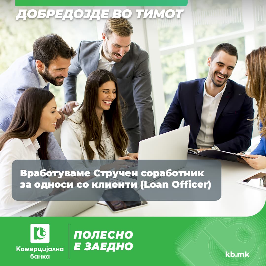 Аплицирајте на: [email protected] или на адреса: Сектор за човечки ресурси и општи работи, Комерцијална банка АД Скопје, ул. Орце Николов бр. 3, 1000 Скопје, со назнака: „Oглас за вработување Стручен соработник за односи со клиенти (Loan Officer)”.