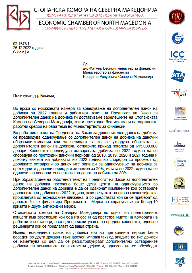 Имено, потврда за тоа дека и при јавни расправи забелешките на бизнисот не се земени предвид е и првиот допис кој беше доставен од Комората до министерот за финансии на 26.12.2022 година, со конкретни укажувања на тогаш именуваниот Предлог на Закон за дополнителен данок на добивка (подоцна преименуван во Законот за данок на солидарност), во кој посочивме дека е суштински важно да се дефинира поимот екстра профит за да не се случи да се даночат компании кои оствариле позитивни резултати на база на нивно добро работење, зголемени инвестиции, подобрена продуктивност, освојување на нови пазари и слично.