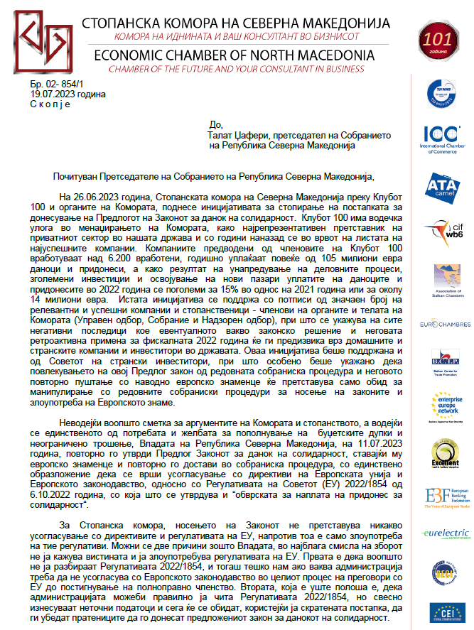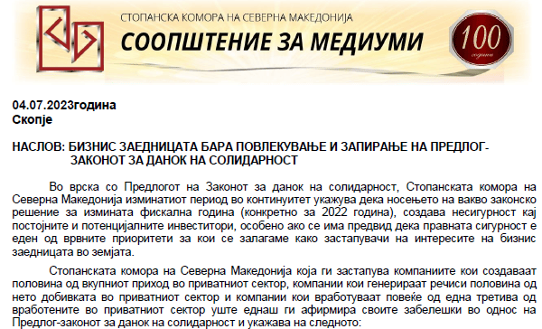 Откако на сите овие укажувања не добивме писмена реакција, на 19.7.2023 година упативме повторно допис до Претседателот на Собранието на Република Северна Македонија, до Претседателот на Владата на Република Северна Македонија и до Министерот за финансии на Република Северна Македонија во кои на еден сеопфатен начин се образложени аргументите за барањето на бизнис заедницата за запирање на постапката за донесување на предложениот Закон за данок на солидарност, по итна постапка со европско знаменце.