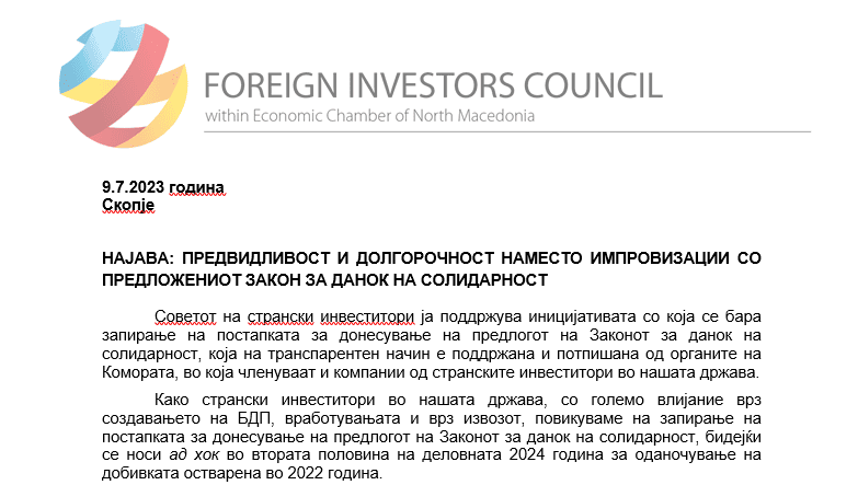 На 04.07.2023 година, Стопанската комора преку јавноста информираше дека повторно бара да се повлече и да се стопира постапката за носење на Законот за данок на солидарност, со укажување дека носењето на вакво законско решение создава несигурност кај постојните и потенцијалните инвеститори, особено ако се има предвид дека правната сигурност е еден од врвните приоритети за кои се залагаме како застапувачи на интересите на бизнис заедницата во земјата (СКСМ ги застапува компаниите кои создаваат половина од вкупниот приход во приватниот сектор, компании кои генерираат речиси половина од нето добивката во приватниот сектор и компании кои вработуваат повеќе од една третина од вработените во приватниот сектор). Воедно, на 9.7.2023 година Советот на странски инвеститори јавно упати порака за предвидливост и долгорочност наместо импровизации со носење на предложениот Законот за данок на солидарност.