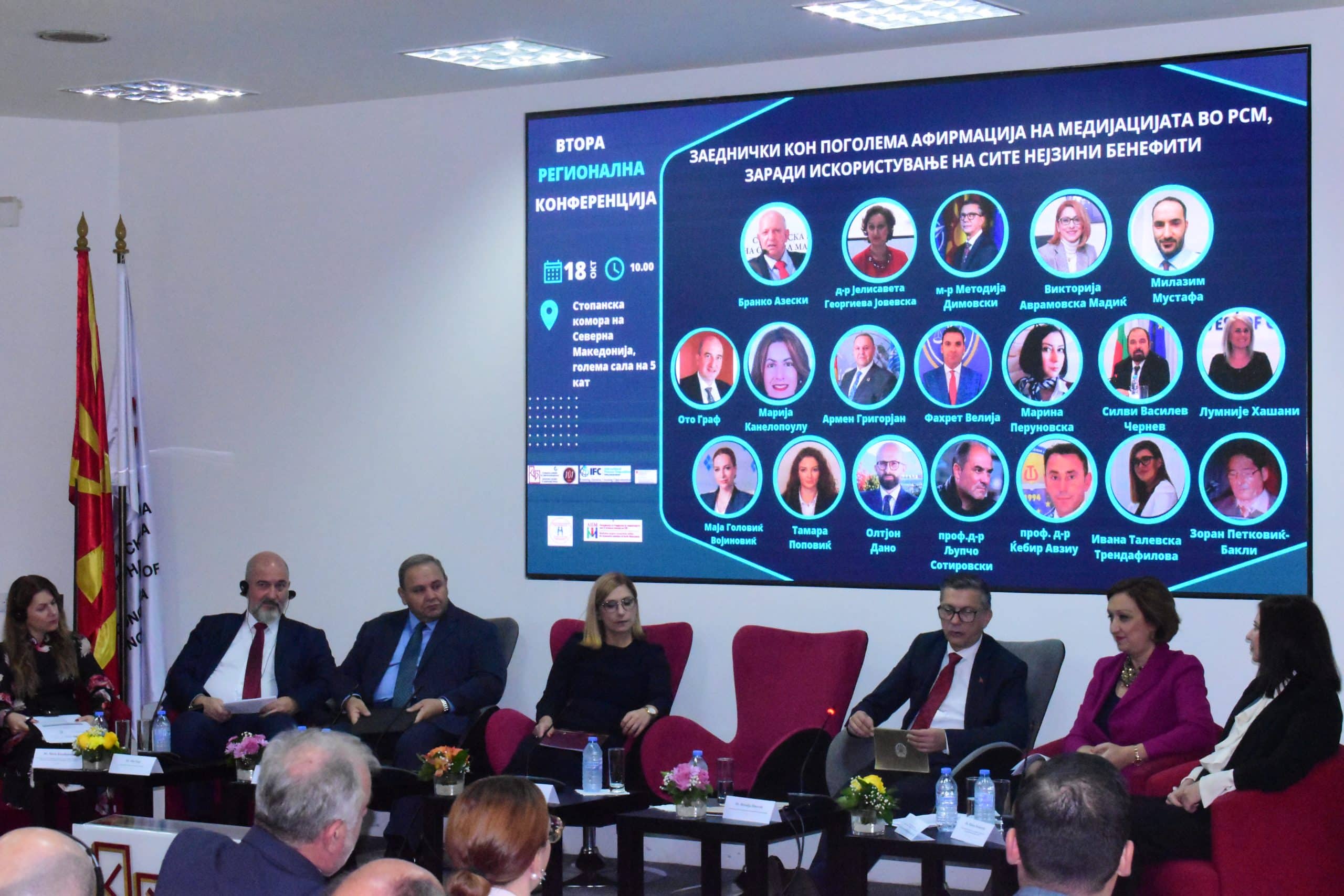 На регионалната конференција панелисти беа и координаторите од Асоцијациите за медијација при Стопанските комори од Македонија, Србија, Албанија, Косово, Бугарија и Црна Гора. Тие говореа за постигнувањата и користењето на медијацијата, секој во својата земја, како и за чекорите кои треба поединечно секоја институција да ги презе, за уште поголема афирмација на медијацијата.