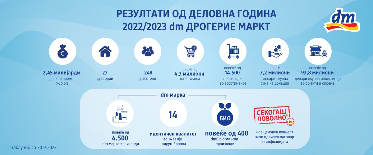 Компанијата dm дрогерие маркт со промет од 2,45 милијарди денари и раст од 36,6 % одбележува 11 години деловно работење на македонскиот пазар. Во изминатата деловна година, најголемиот дрогериски ланец во Европа лансира нов ценовен концепт „Секогаш поволно“ на македонскиот пазар со кој се гарантира стабилност на цените во моменти на сѐ поголема инфлација. Освен тоа, dm го прошири своето присуство на пазарот со нова дрогерија во новоотворениот трговски центар – Штип Сити Мол.