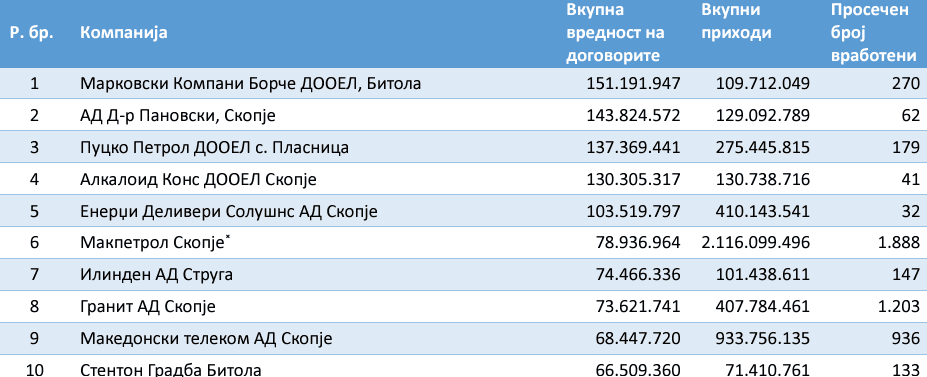 Рекордерот во освојување на тендерите е Марковски Компани Борче ДООЕЛ Битола. Во една петолетка има добиено повеќе од 151 милион евра.