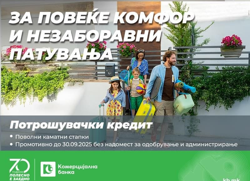 Ако, пак, планираш патување, реновирање или имаш некој друг план, Потрошувачкиот кредит на Комерцијална банка ти стои на располагање, исто така, со промотивни услови – без трошоци за одобрување и администрирање до 30.09.2025.