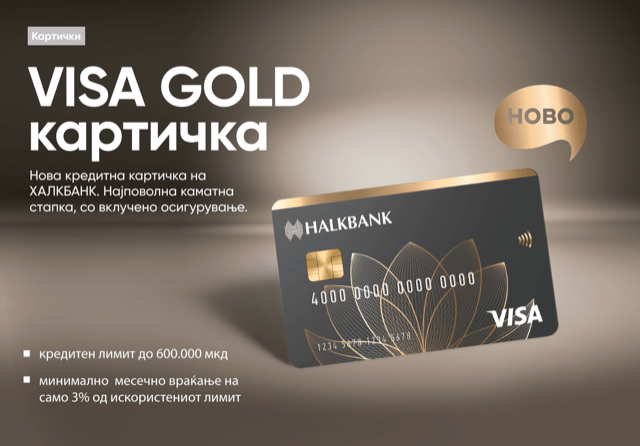 Халкбанк, покрај останатите кредитни картички, од неодамна во своето портфолио ја воведе новата Visa Gold кредитна картичка. Новата Visa Gold овозможува кредитен лимит до 600.000 денари, во зависност од кредитоспособноста на корисникот, а нуди можност за месечна минимална отплата на само 3% од искористениот лимит и има најниска каматна стапка за овој вид картички од само 7,5%. Картичката е достапна за сите физички лица со редовни месечни примања кои ја примаат својата плата или пензија во Халкбанк АД Скопје, како и лица кои ќе ја обезбедат картичката со депозит. Дополнително, за добивање на картичката нема потреба од жиранти, нема административна забрана од плата и не се плаќаат трошоци за одобрување.