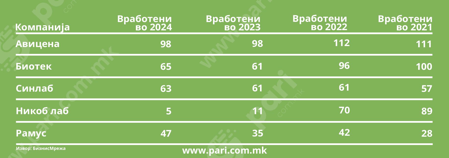 Во овој втор дел се фокусираме на човечкиот капитал, од податоците на Бизнис мрежа може да се види колку лица се вработени во овие лаборатории, како се менувал нивниот број во изминатите четири години и колкави плати примаат. Бројот на вработени и просечната нето-плата се директен одраз на деловната стратегија: дали компаниите вложуваат во тимот или се принудени на рационализација и кратење.