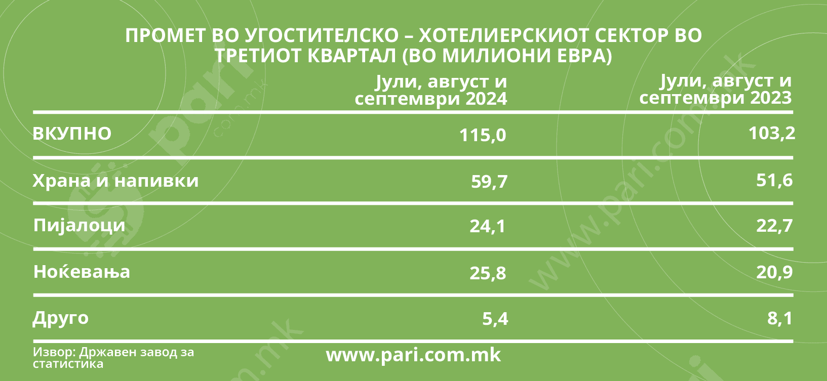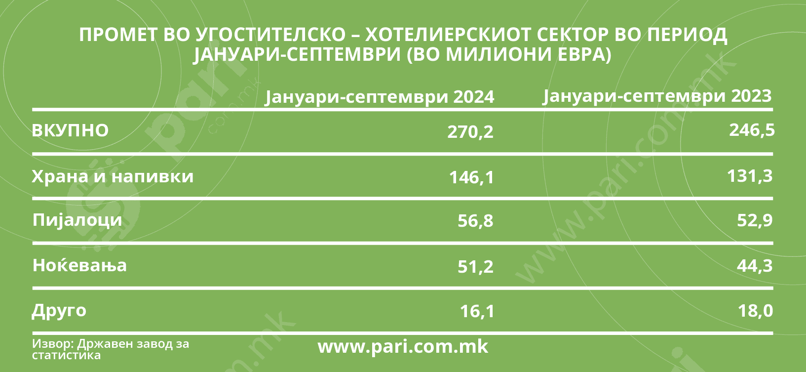 Угостителите и хотелиерите може задоволно да ги тријат рацете за сработеното во овој период, затоа што имаат остварено поголем приход отколку претходната година во истиот период од 9 месеци. Приходот во 2023 година заклучно со септември бил 246,5 милиони евра, или за 23,7 милиони евра помалку од оној во 2024 година за истиот период. Сепак, мора да се земе предвид дека дел од растот на приходот се должи на инфлацијата којашто во угостителскиот сектор во деветте месеци од 2024 година во однос на деветте месеци од 2023 година изнесувала 5,5 насто. Но, факт е дека дури и да се додаде тој процент на прометот за периодот од јануари до септември 2023 година ќе се добијат 260 милиони евра, што пак е помалку од ланскиот приход од 270,2 милиони евра, покажува пресметката на порталот Пари.