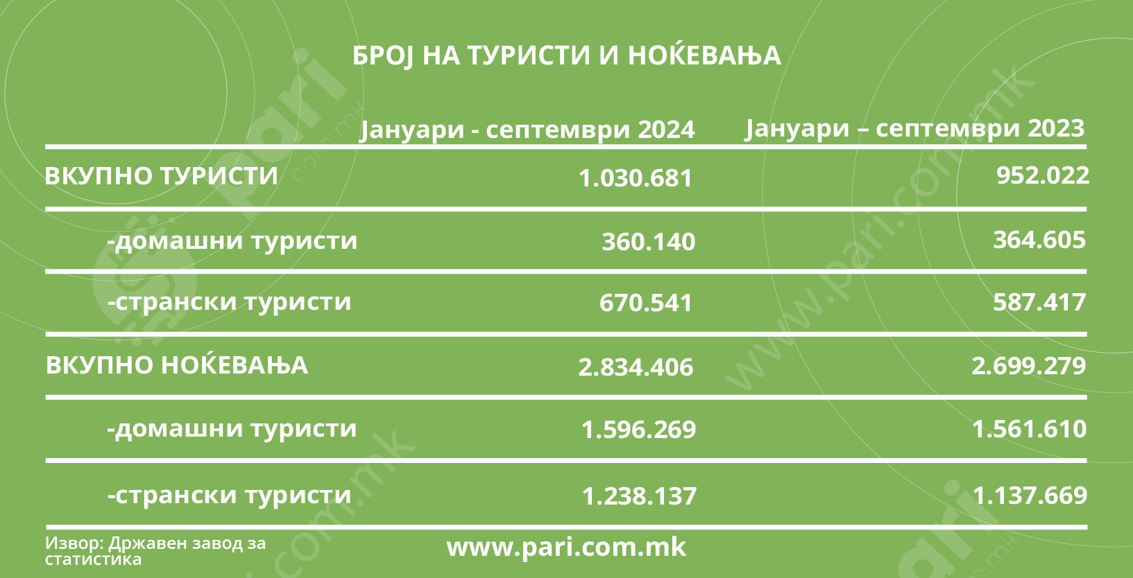 Ова се подобри резулати отколку во 2023 година, кога имало вкупно 952.022 туристи и вкупно 2.699.279 ноќевања за 9 месеци.
