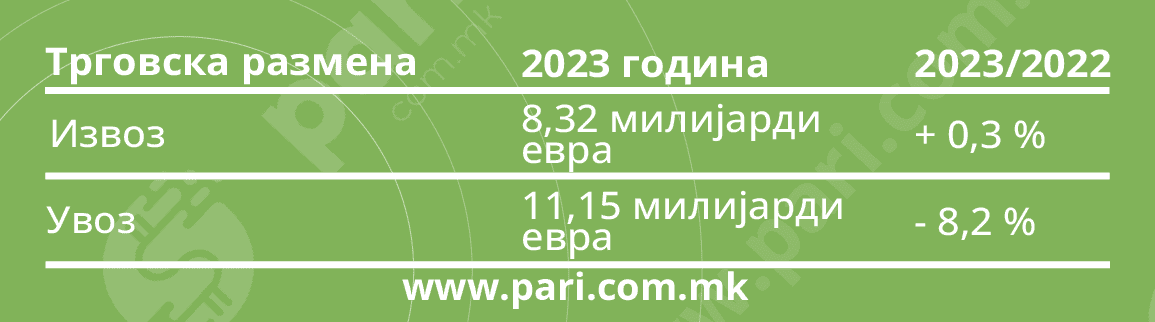 Минатата година трговската размена била 19,5 милијарди евра, објави Државниот завод за статистика. Притоа, сме реализирале извоз од 8,32 милијарди евра, а увозот ни „тежел“ 11,15 милијарди евра. Извозот е поголем за 0,3 насто, а увозот е помал за 8,2 насто во однос на 2022 година.