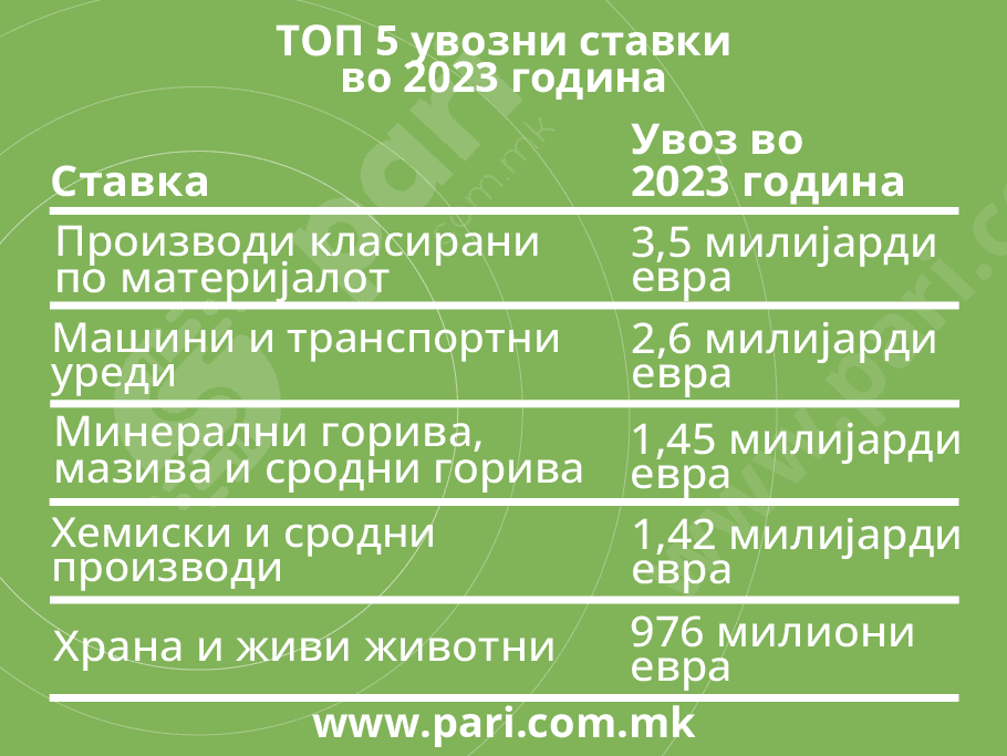 Што се однесува, пак, до ставки коишто имале најголемо учество во минатогодишниот увоз, податоците покажуваат дека тоа е ставката производи класирани по материјалот, каде увозот чинел 3,5 милијарди евра, или 31,4 насто од целиот увоз. Во оваа ставка, на пример, влегуваат разни производи од железо и од челик. Потоа, на второ место е ставката машини и транспортни уреди, каде што е направен увоз од 2,6 милијарди евра. Големо е учеството и на ставката минерални горива, мазива и сродни горива – 1,45 милијарди евра, а речиси ист увоз, односно увоз од 1,42 милијарди евра, има ставката хемиски и сродни производи. Во ТОП 5 увозни ставки влегува и увозот на храна и живи животни, со 976 милиони евра.