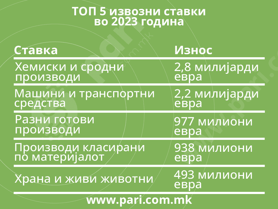 Најголем извоз лани сме направиле со хемиски и сродни производи, речиси 2,8 милијарди евра, што е 33,6 насто во однос на нашиот вкупен извоз. Тоа се должи на производството од страна на Џонсон Мети. На второ место е извозот на машини и транспортни средства, и изнесува 2,2 милијарди евра, каде значајно место, секако, зазема фабриката за автобуси Ван Хол. Потоа е извозот на разни готови производи, со 977 милиони евра, па производи класирани по материјалот, со 947 милиони евра. На петтото место по учество во извозот е ставката храна и живи животни, каде сме реализирале извоз од 493 милиони евра.