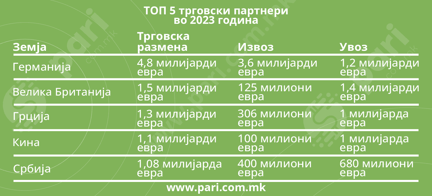 Веќе е добро познато дека нашиот најголем трговски партнер е Германија. Од особена важност е што таму имаме суфицит во трговската размена. Затоа за нас е толку важно тоа што се случува со германската економија. Трговската размена со Германија учествува со 24,6 насто во вкупната трговска размена во 2023 година, и таа изнесува 4,8 милијарди евра. На второ место е Велика Британија, со 1,5 милијарди евра, трет трговски партнер ни е Грција, со 1,3 милијарди евра, четврт Кина, со 1,1 милијарди, и петти Србија, со 1 милијарда евра.