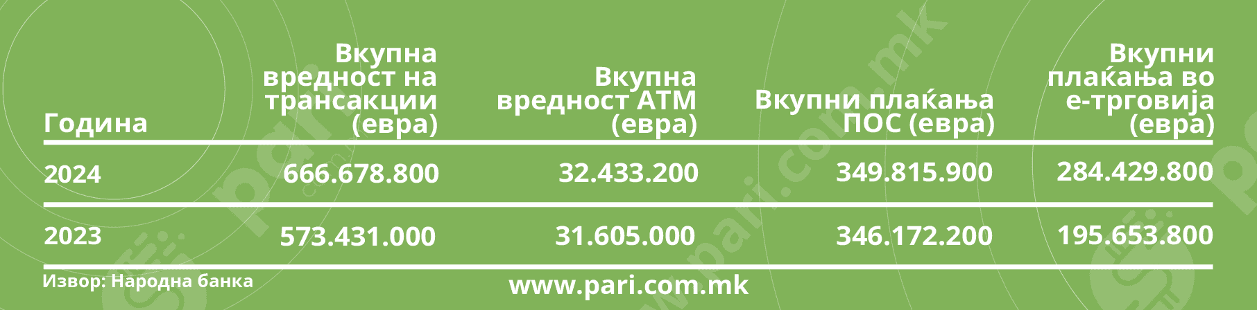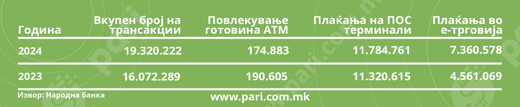 Споредено со претходната, 2023 година, вкупниот број на трансакции е зголемен за 20,21 насто. Најголемото влијание произлегува од плаќањата во е-трговијата, каде што годишната промена е за високи 61,38 насто. Раст има и кај плаќањата на ПОС-терминалите во странските земји (+ 4,10 %). Веројатно поради банкарските провизии, кога се некаде низ светот, граѓаните полека отстапуваат од кешот повлечен од банкоматите (− 8,25 %).