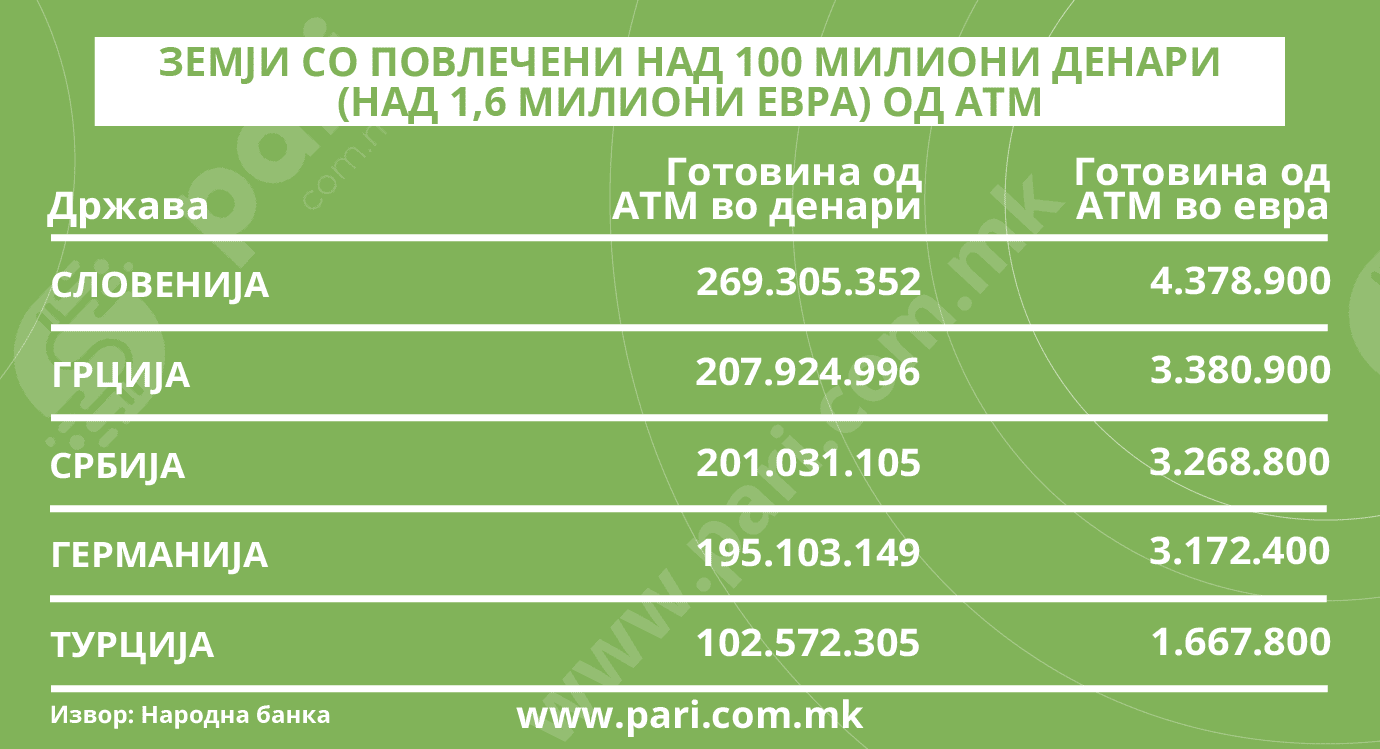 И покрај предностите на безготовинските плаќања, пожелно е хартиените банкноти да се прирака. Потребата за готовина на нашите сограѓани е најизразена во Словенија (близу 4,4 милиони евра), која е на врвот од петте земји каде што лани се подигнати најголеми износи, повисоки од 100 милиони денари, односно од 1,6 милиони евра. Тоа може да се поврзе со сѐ поголемиот број млади коишто студираат на словенечките факултети. Следуваат Грција (3,38 милиони), Србија (3,27 милиони), Германија (3,17 милиони) и Турција (1,7 милиони).