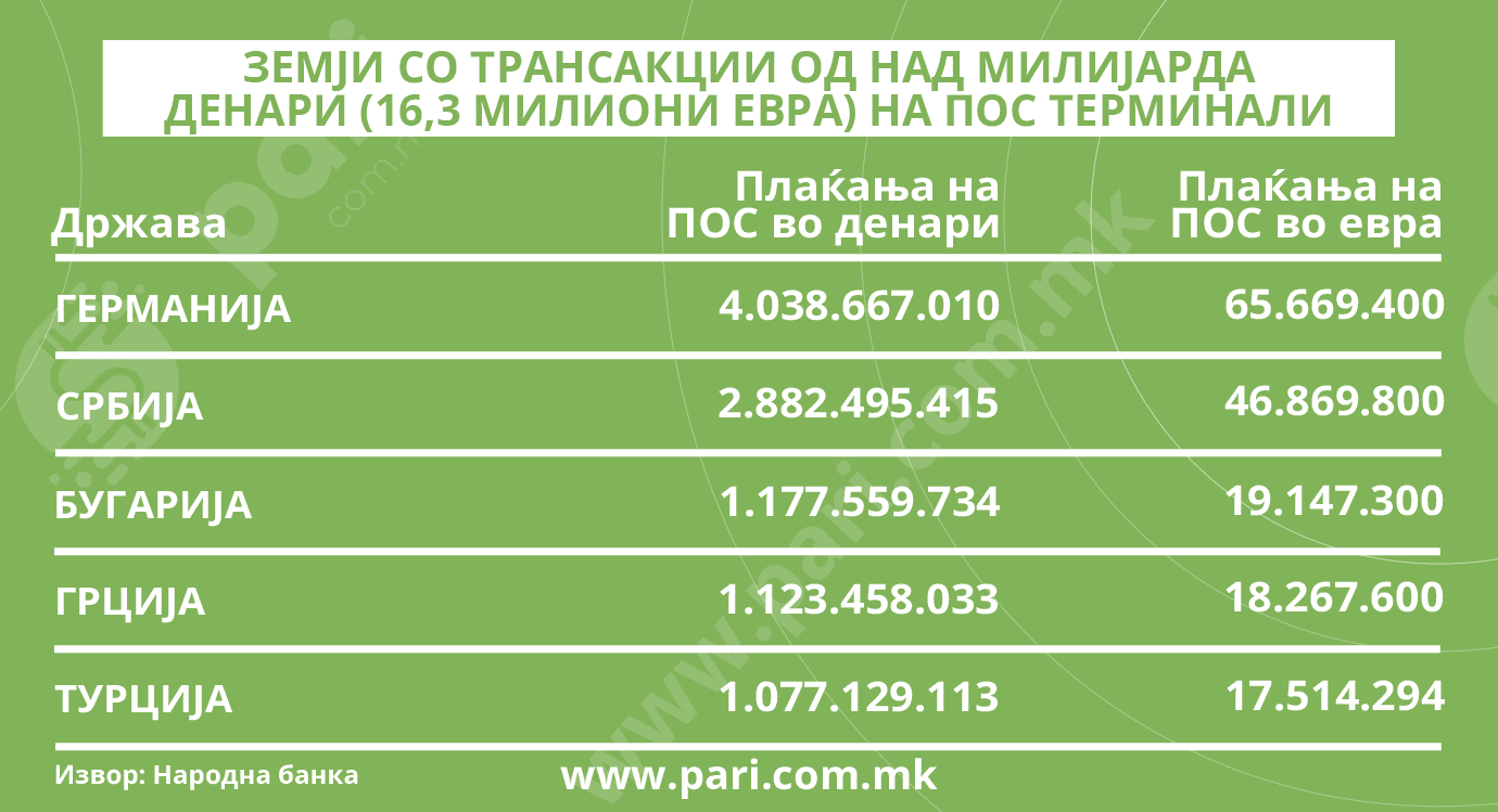 Бројките поврзани со плаќањата на самото место го потврдуваат тоа што веќе се знае: најчесто се патува во соседството, а водечката улога ја има подалечна земја ‒ Германија, каде што живеат и работат добар дел од македонските граѓани. Во тамошната малопродажна мрежа, преку македонски картички лани се оставени 65,7 милиони евра. Во Србија, пак, се потрошени 46,9 милиони евра. Иако трета, со износот од 19,1 милион евра заостанува Бугарија, зад која се Грција (18,2 милиони) и Турција (17,5 милиони евра).