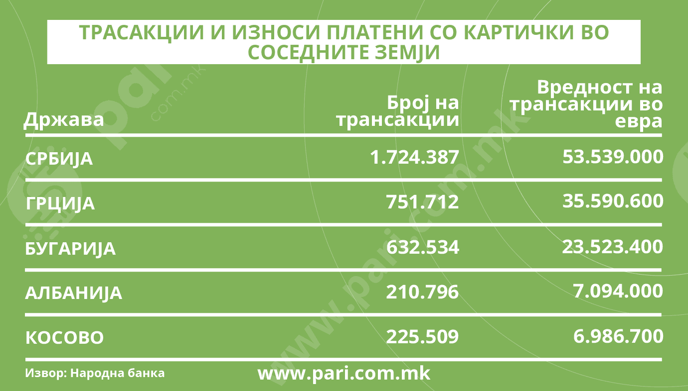 Нашите граѓани секојдневно претрчуваат до соседството, да пазарат, да прошетаат, да одморат… Најголемите трошења во соседните земји со примена на картичките, лани се направени во Србија. И со регистрираните 1.724.387 трансакции и со износот од 53,5 милиони евра е далеку пред останатите, вклучувајќи ја и Грција, која е второрангирана со 35,6 милиони евра од 751.712 трансакции. Најмалубројни се картичните трансакции во Албанија (210.796), а најнискиот износ потрошен во соседството, од скоро седум милиони евра, е во Косово.