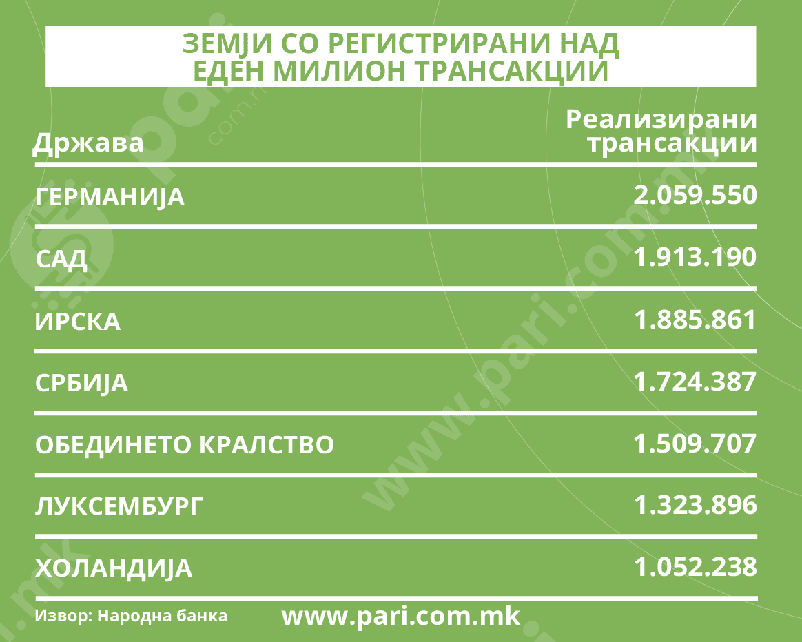 Кога се анализира бројноста, најмногу трансакции со македонски картички во странство се реализирани во Германија – 2,06 милиони. Можеби изгледа малку чудно, но веднаш потоа се САД со 1,91 милион. Високи бројки се забележани и во Ирска, 1,88 милиони трансакции, во Србија (1,72 милиони) и Обединетото Кралство (1,5 милиони). А, тука некаде, со повеќе од еден милион трансакции се и Холандија и Луксембург.