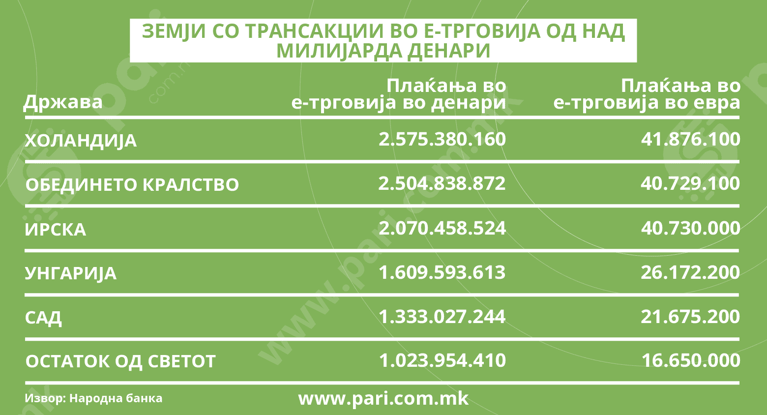 И според вредноста од над 78 милиони евра доминираат трансакциите направени на германската територија. Всушност, износите што го надминуваат прагот од една милијарда денари или 16,3 милиони евра, се евидентирани во осум држави и во остатокот од светот. Тука се Холандија (56 милиони), Србија (53,5 милиони) и Обединетото Кралство (52,4 милиони евра). Како пазари значајни за македонската потрошувачка се издвојуваат и Ирска (42,5 милиони) и САД (34,6 милиони).