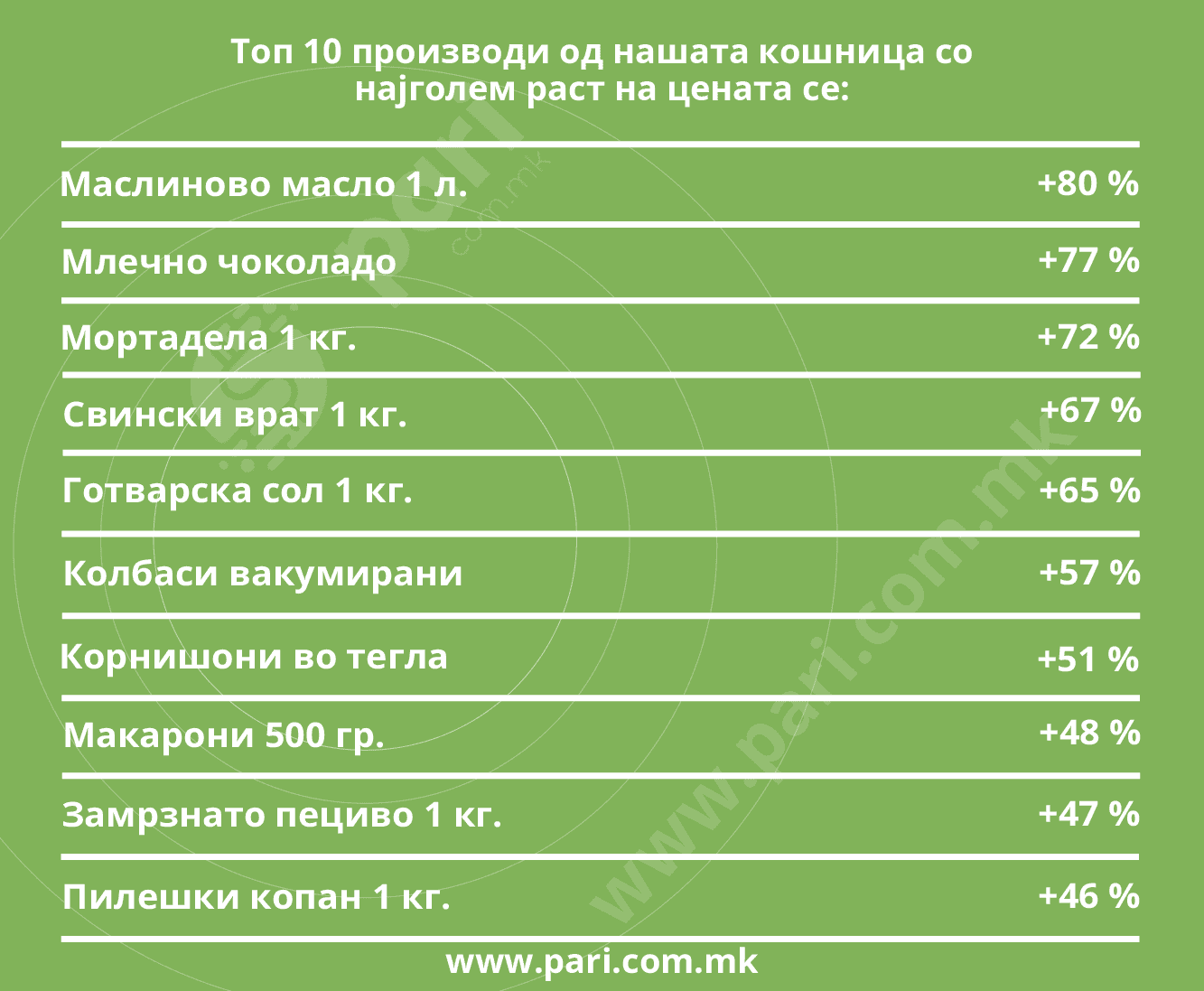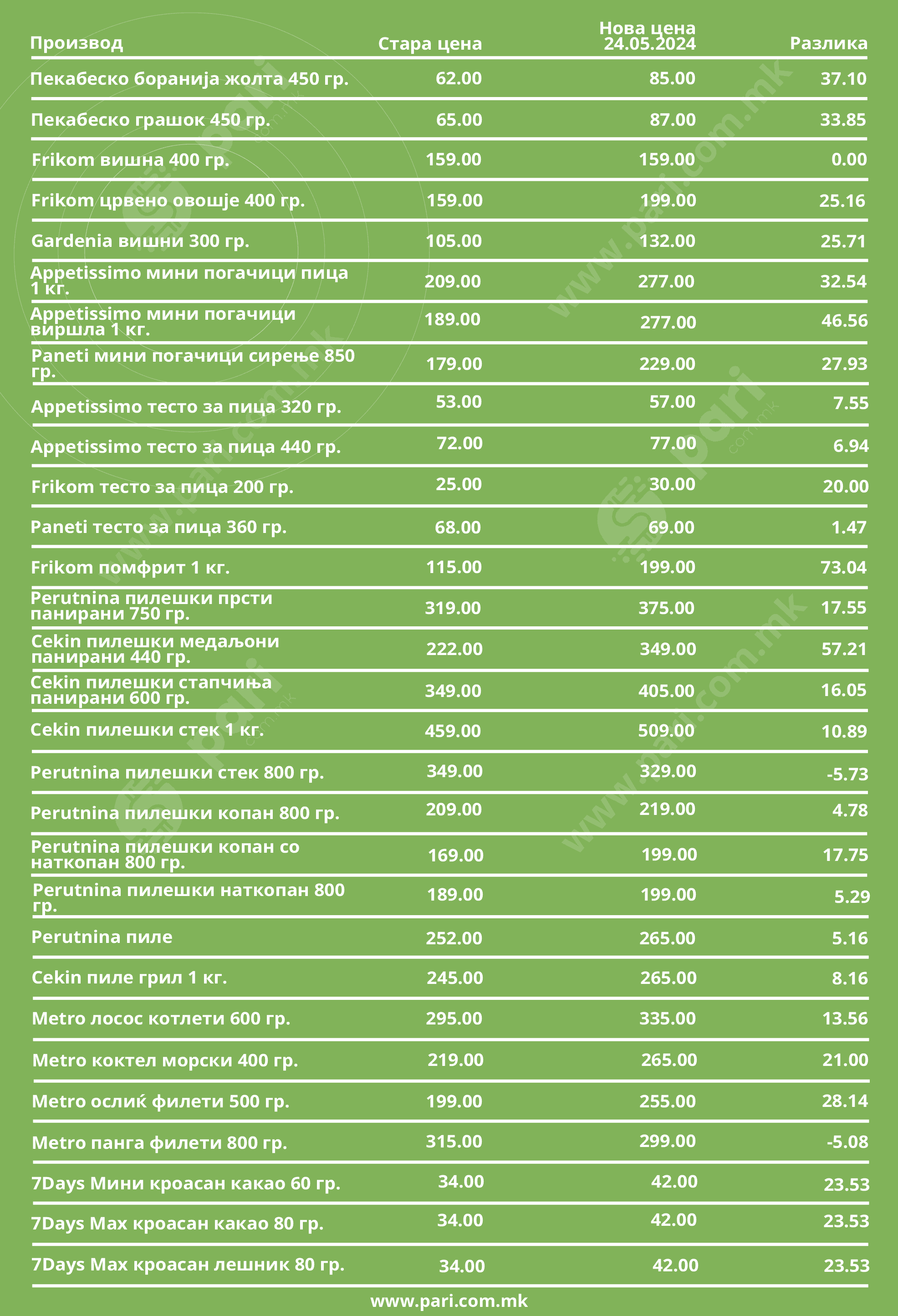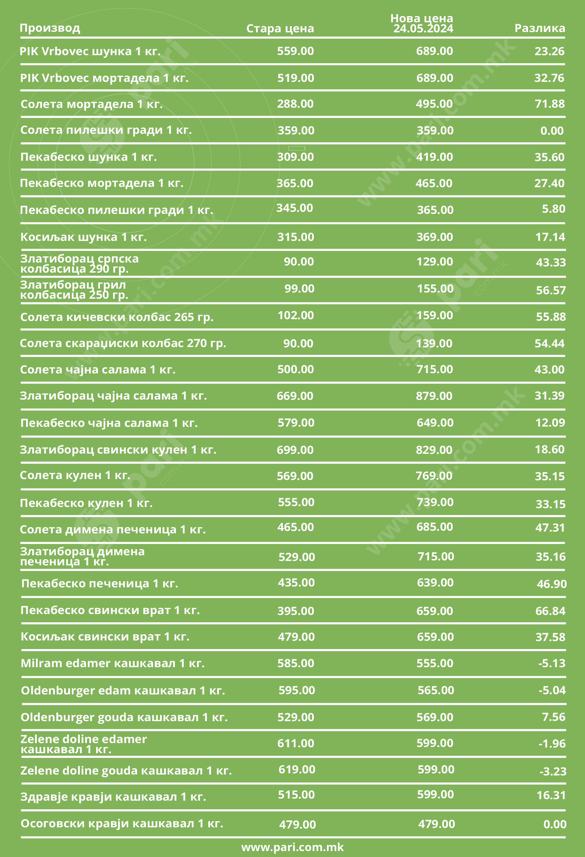 Базата на податоците на порталот „Пари“ покажа дека Costa d’Oro extra virgin маслиновото масло 1 л. поскапе од 685 денари на крајот на 2022 година на сегашни 1.229 денари. На почетокот од нашиот анализиран период солевме со готварска сол која чинеше 17 денари за половина килограм, а сега таа е 28 денари. За љубителите на чоколадо среќни беа времињата кога таа беше 39 денари, затоа што во меѓувреме стигна до 69 денари. За оние што сакаат сувомеснати производи, или мора да издвојат помалку пари, или да ставаат помалку во сендвичот, затоа што мортаделата што ја споредувавме, а која некогаш чинеше 288, сега е 495 денари, шунката што беше 309 денари за еден килограм сега е 415, а димената печеница од истиот производител, која се продаваше за 529 денари, сега е 715 денари. Списокот на нашата опсервација е долг и разочарувачки за потрошувачите.