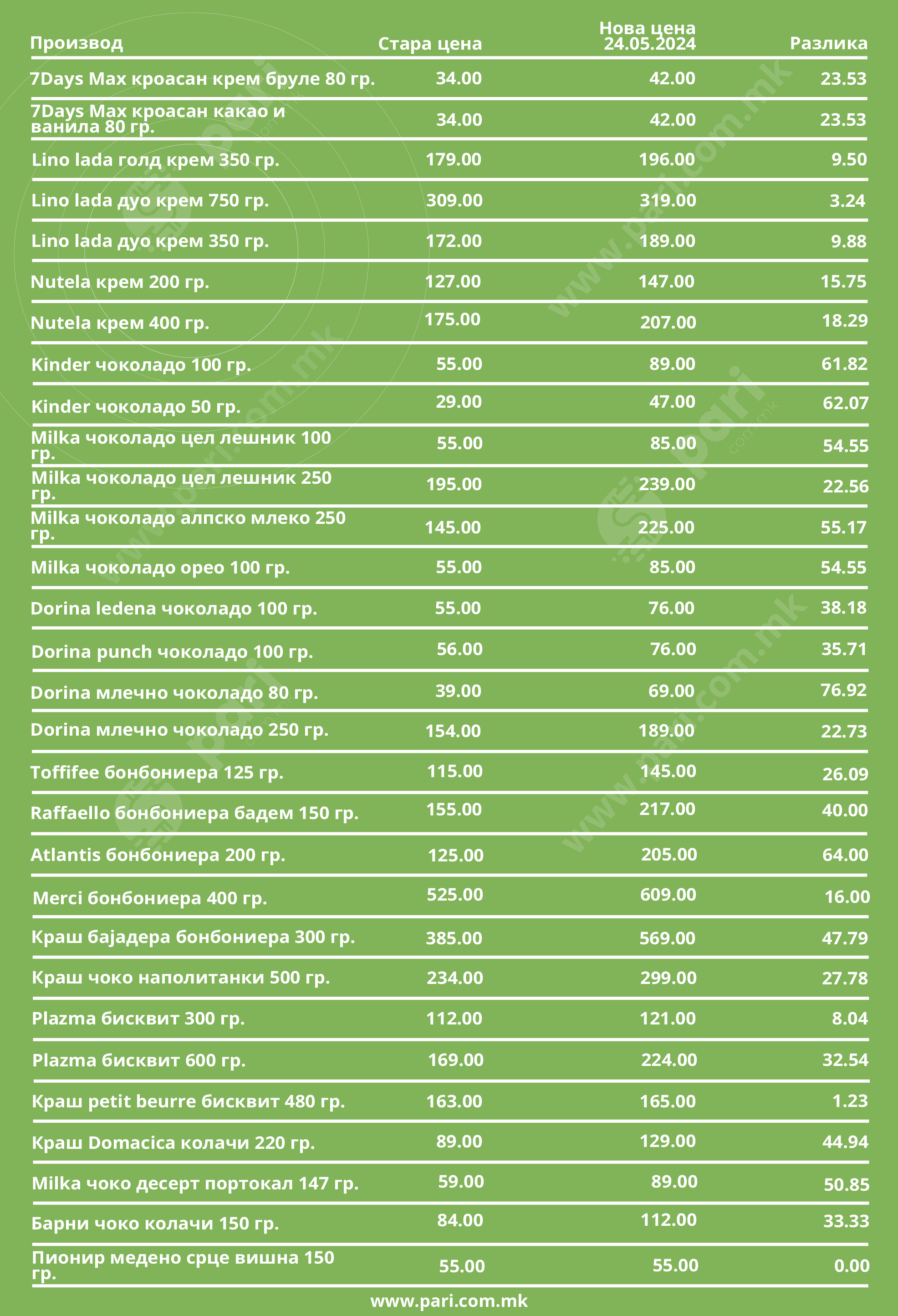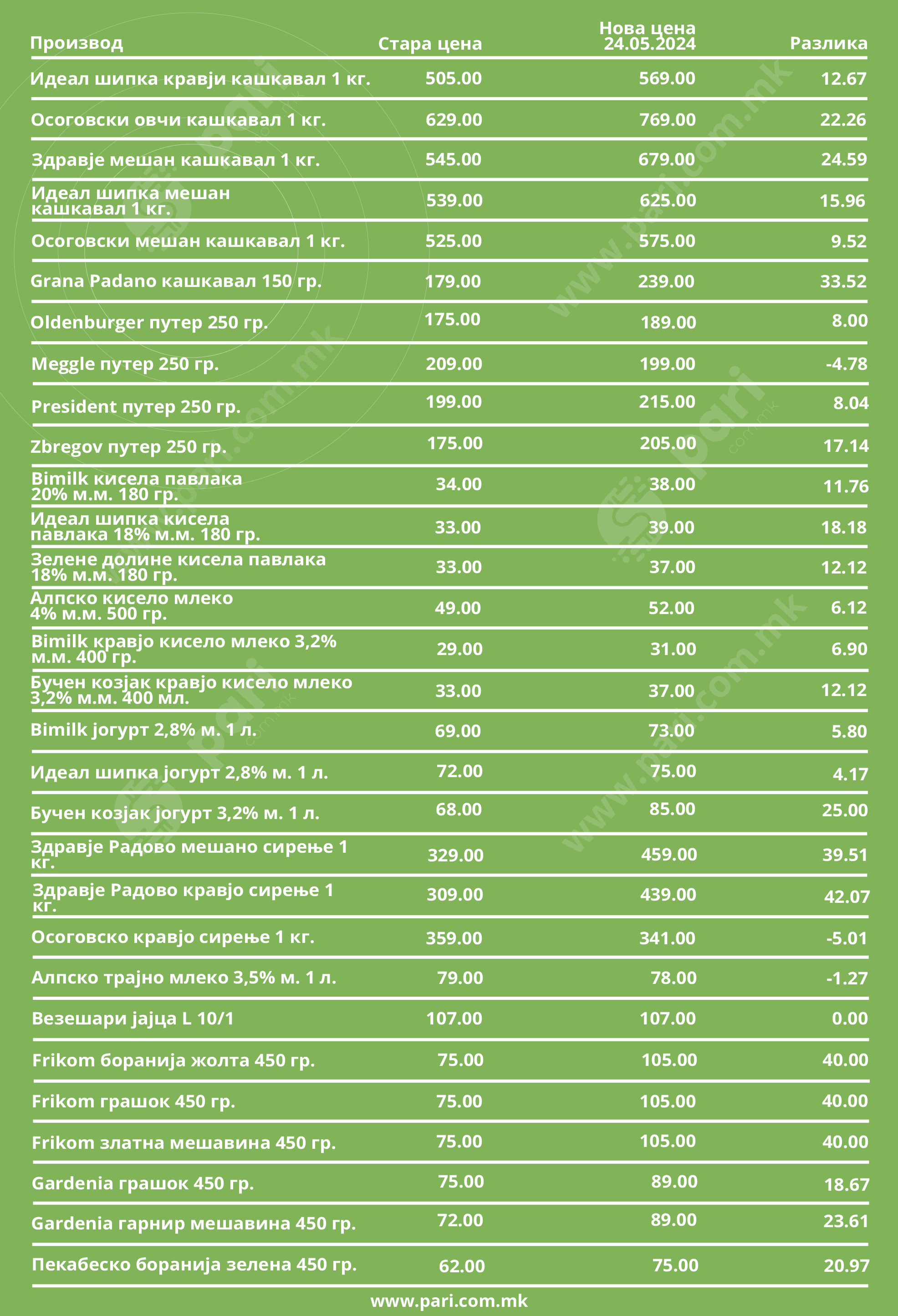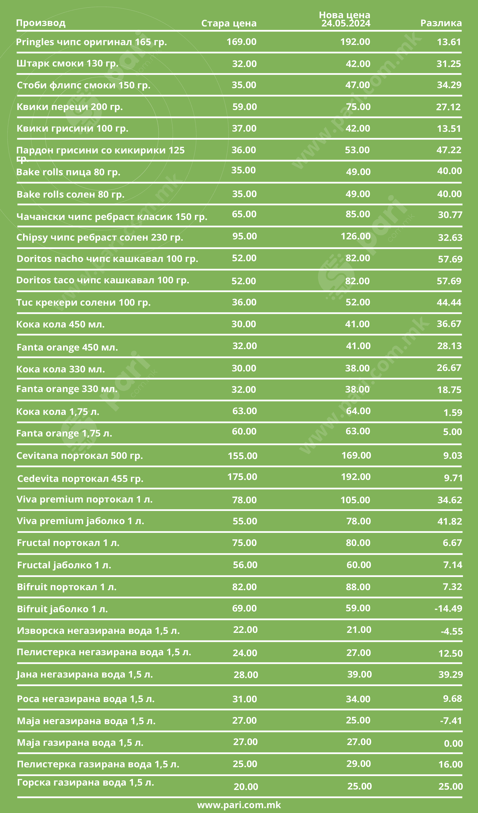 Базата на податоците на порталот „Пари“ покажа дека Costa d’Oro extra virgin маслиновото масло 1 л. поскапе од 685 денари на крајот на 2022 година на сегашни 1.229 денари. На почетокот од нашиот анализиран период солевме со готварска сол која чинеше 17 денари за половина килограм, а сега таа е 28 денари. За љубителите на чоколадо среќни беа времињата кога таа беше 39 денари, затоа што во меѓувреме стигна до 69 денари. За оние што сакаат сувомеснати производи, или мора да издвојат помалку пари, или да ставаат помалку во сендвичот, затоа што мортаделата што ја споредувавме, а која некогаш чинеше 288, сега е 495 денари, шунката што беше 309 денари за еден килограм сега е 415, а димената печеница од истиот производител, која се продаваше за 529 денари, сега е 715 денари. Списокот на нашата опсервација е долг и разочарувачки за потрошувачите.