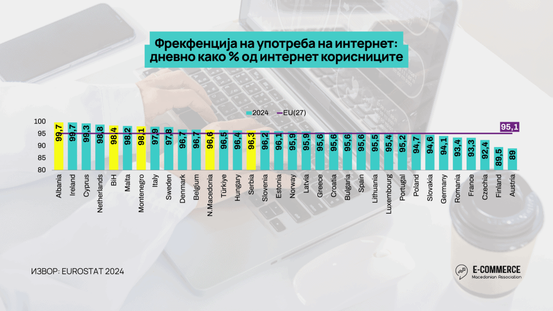 Дополнително, 96,6% од нив го користат интернетот секојдневно, што ја става земјата над голем број развиени европски економии. Ова покажува дека, еднаш кога пристапот е обезбеден, интернетот станува навика, алатка и простор за комуникација, информирање и купување. Но, високата онлајн активност не значи сама по себе и силна е-трговија.