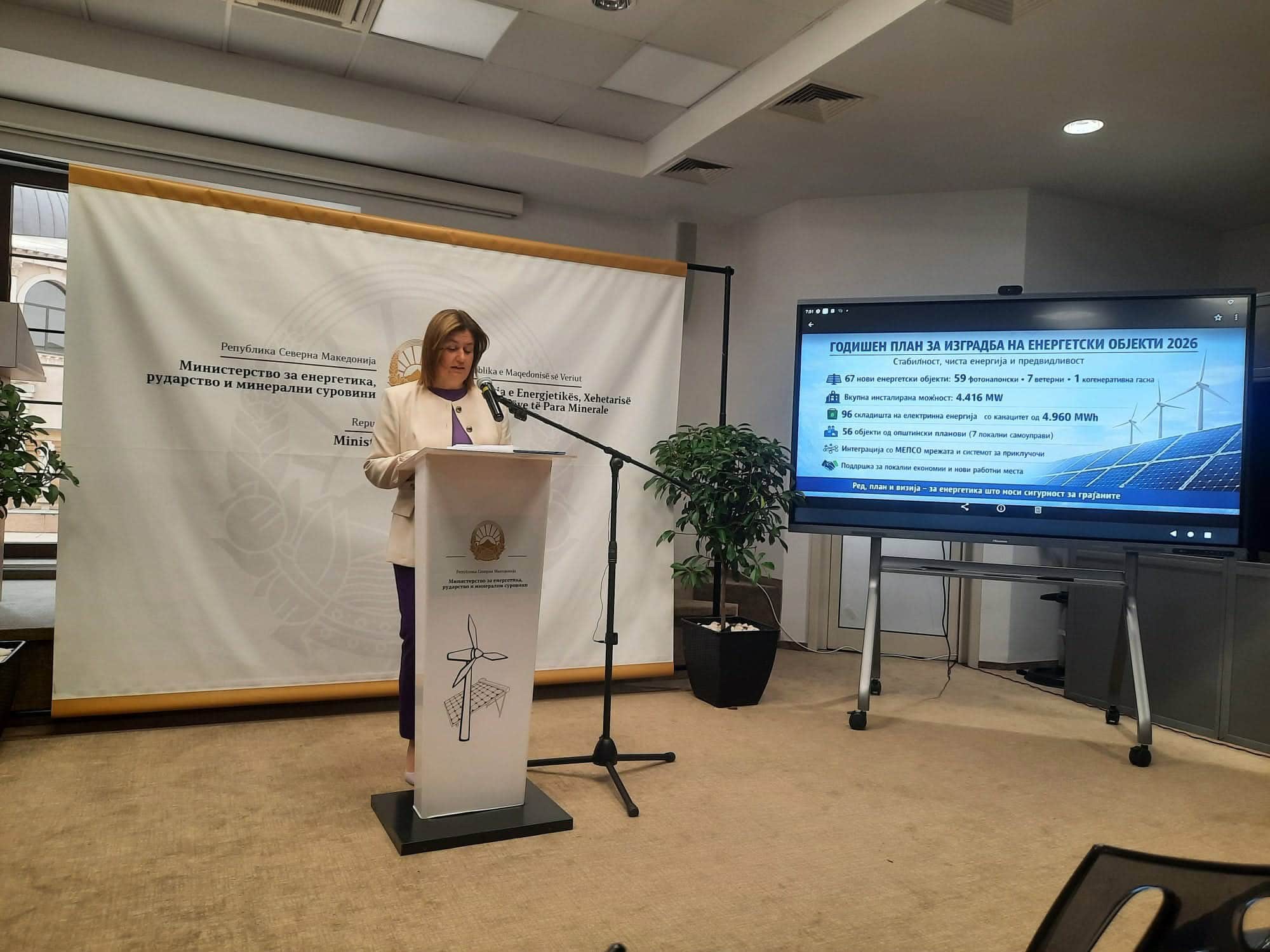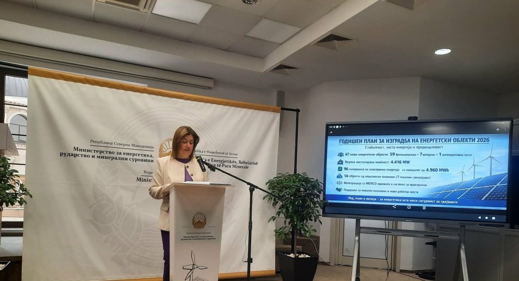 Шеесет и седум нови енергетски објекти со моќност од најмалку еден мегават со вредност од над 3,730 милијарди евра се предвидени со Годишниот план за изградба на енергетски објекти, кој Владата го усвои на последната седница, објави министерката за eнергетика, Сања Божиновска, на денешната прес конференција. „Зборуваме за вкупно инсталирана моќност од неверојатни 4.416,803 мегават часа“, потенцираше министерката.
