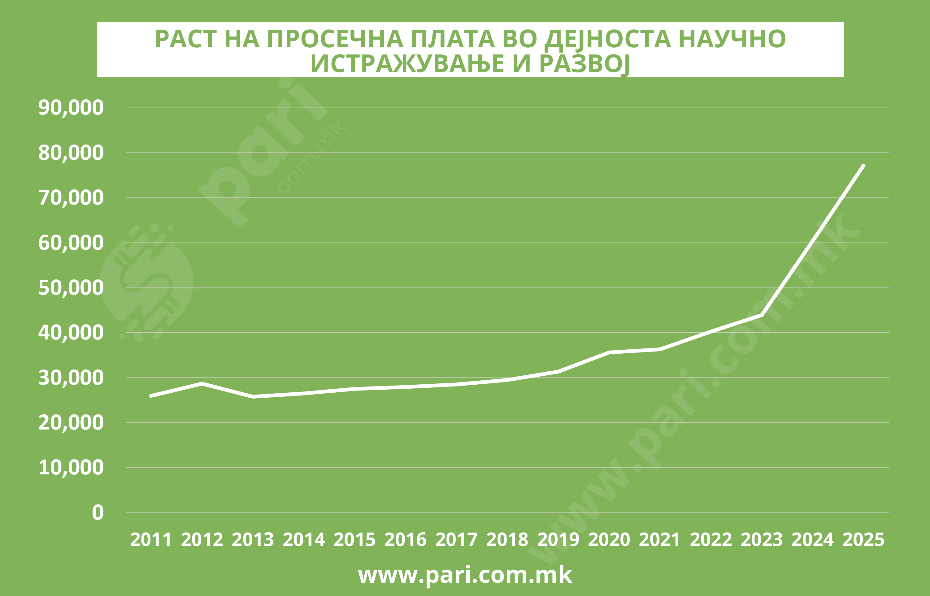 Значително е зголемена просечната плата во компаниите и институциите за научно истражување и развој, од 25.995 денари во 2011 година на 77.200 денари во 2025 година.